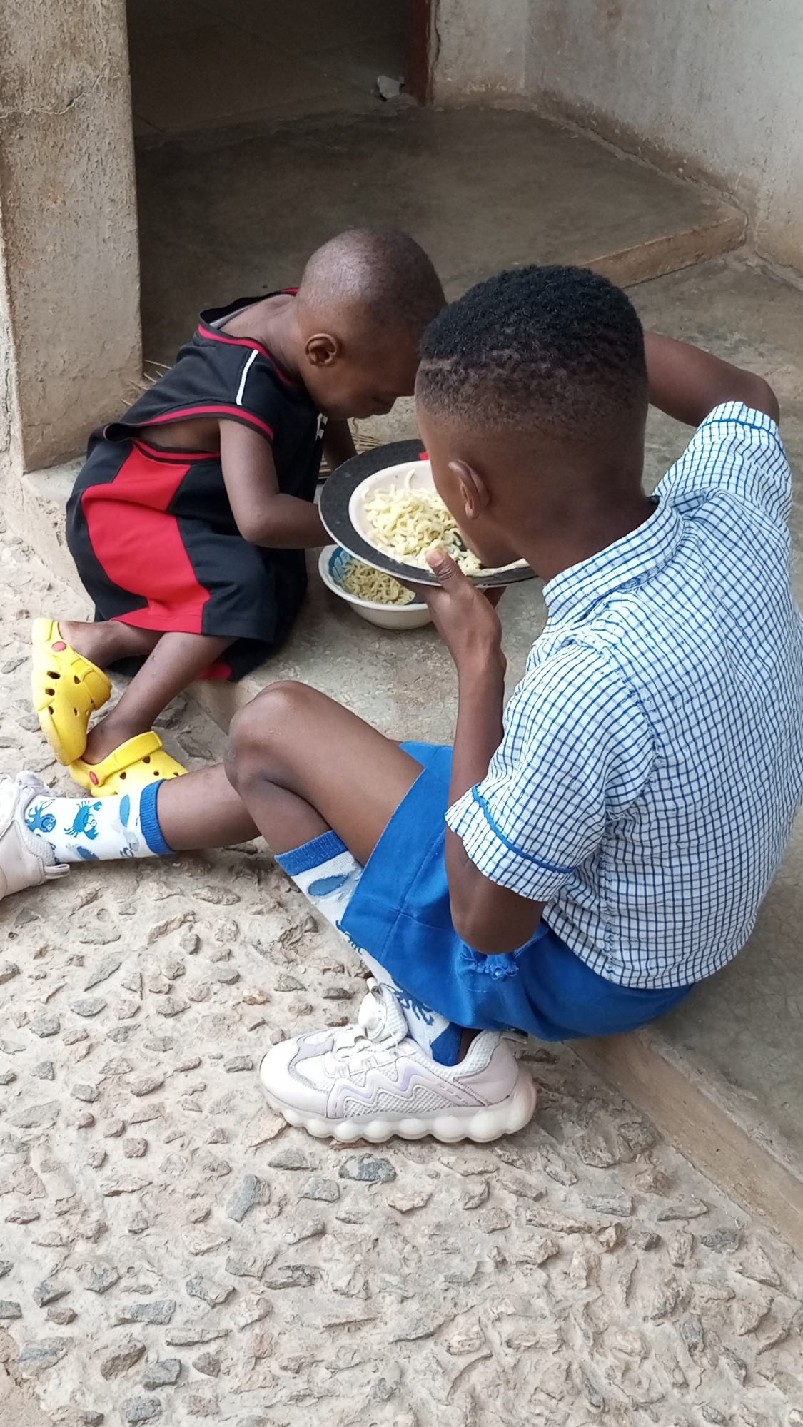 Two young African boys are sitting on a rough, stone surface in Sabon Tasha, Nigeria, sharing a meal of noodles. One boy is wearing a black and red tank top with yellow Crocs, and the other is in a bl…read more