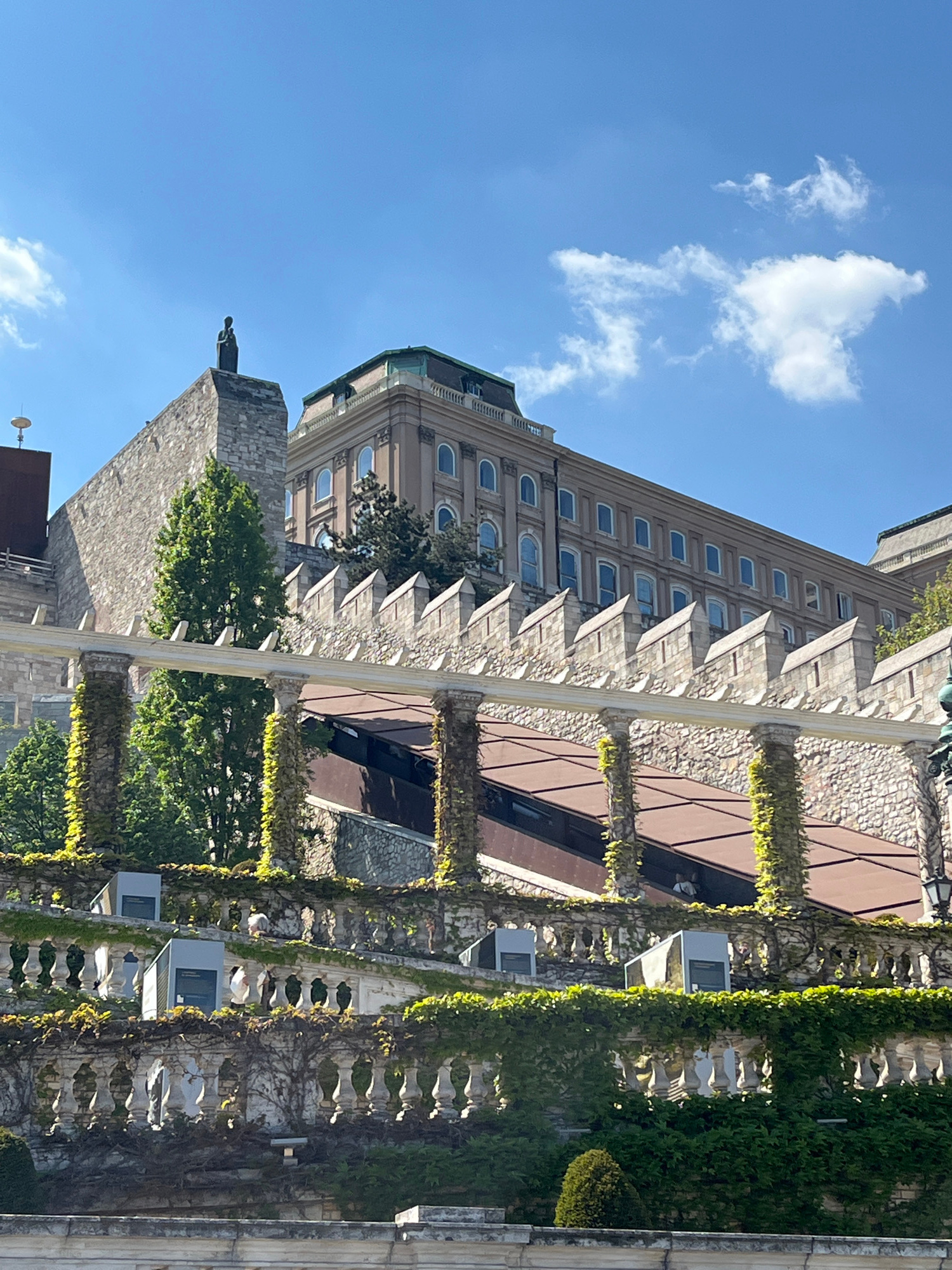 This image depicts a scene in Budapest, Hungary. A tall, ornate building with multiple windows and detailed stonework is visible. A statue stands atop a stone structure in the foreground. A pergola-liβ¦read more