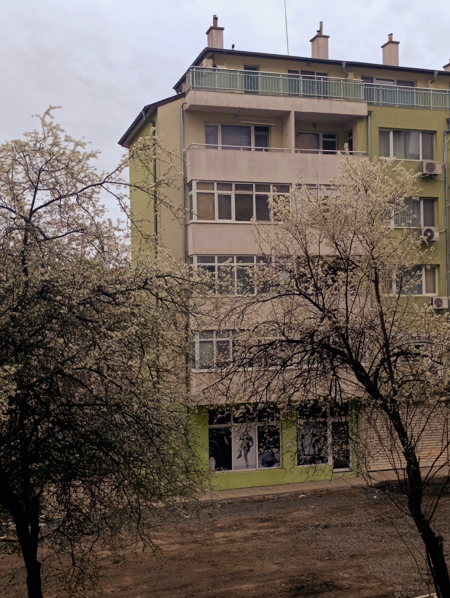 The image shows a multi-story building in Kardzhali, Bulgaria, with trees in bloom partially obscuring the view. The building's facade is painted in shades of light green and beige. There are multiple…read more