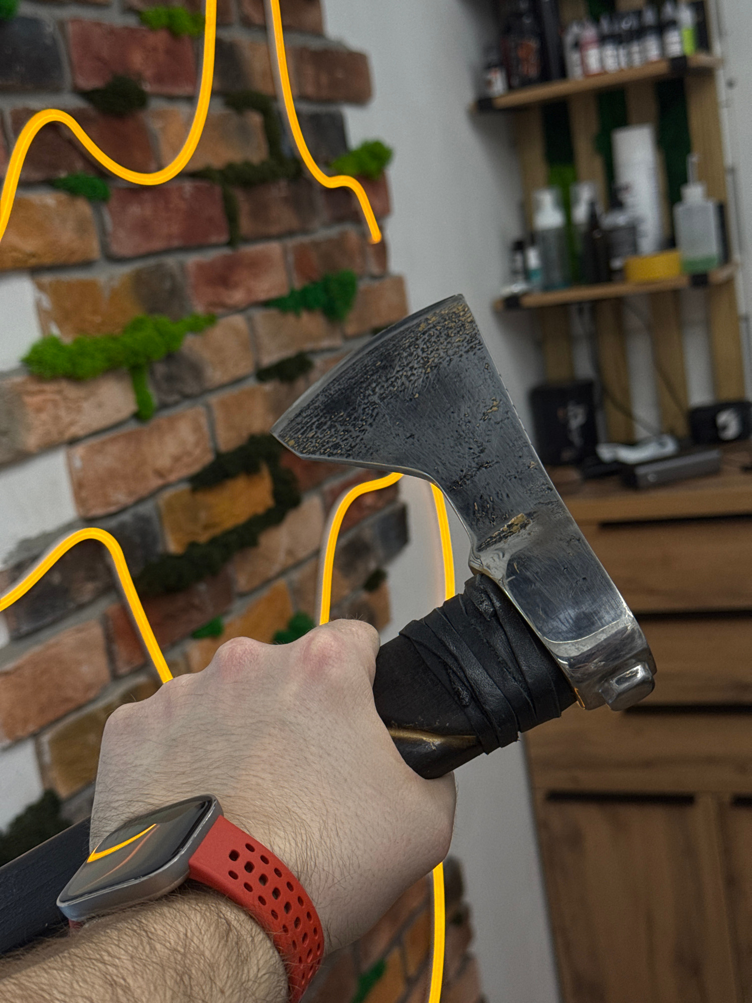 A close-up shot depicts a hand holding a small axe. The axe has a dark, weathered blade and a leather-wrapped handle. The hand is fair-skinned and wears a red and black smartwatch on the wrist. The ba…read more