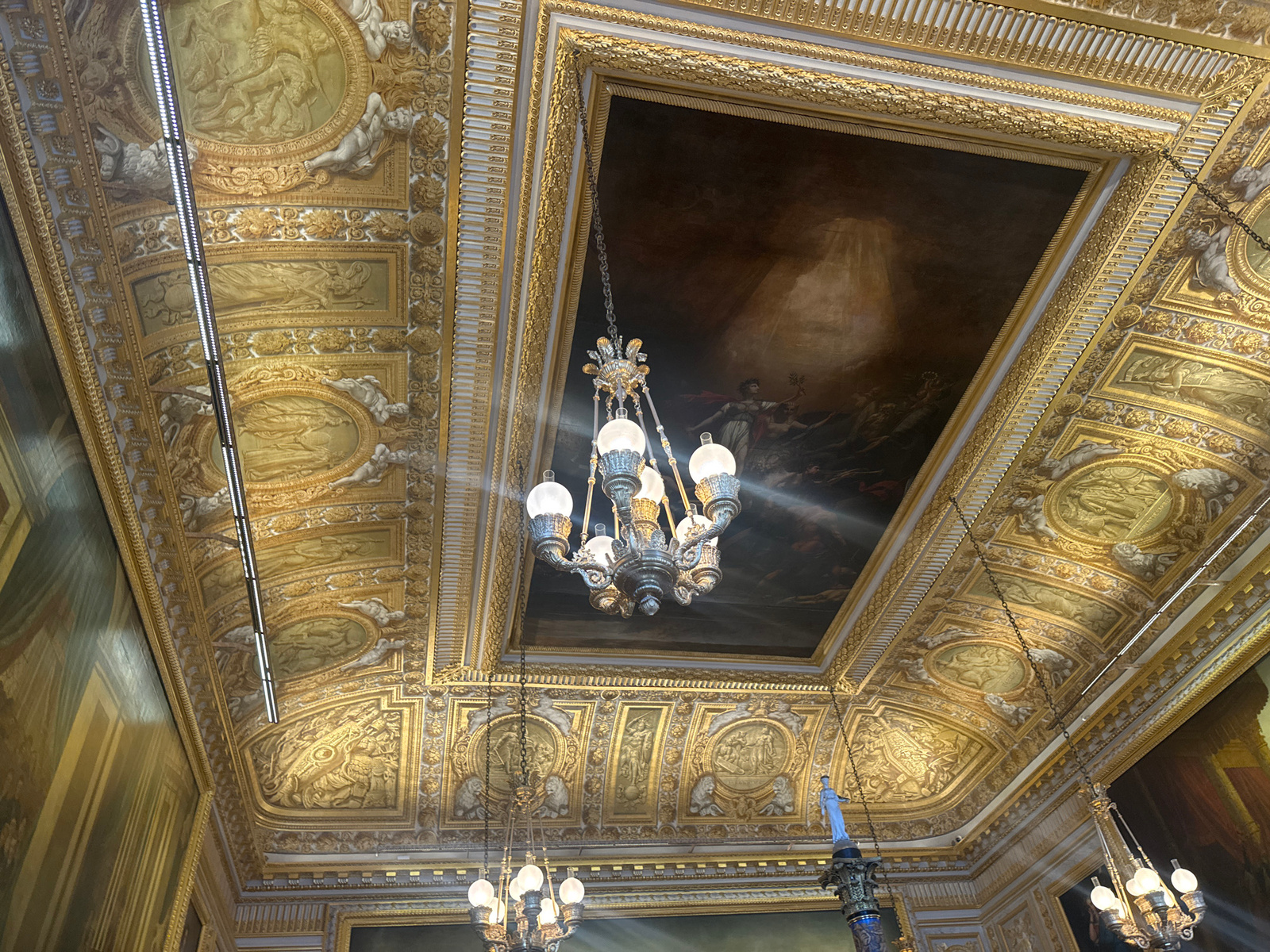 The image shows an ornate, gold-decorated ceiling, possibly in a palace or historic building. A large rectangular panel in the center of the ceiling depicts a painting, likely a historical or religiou…read more