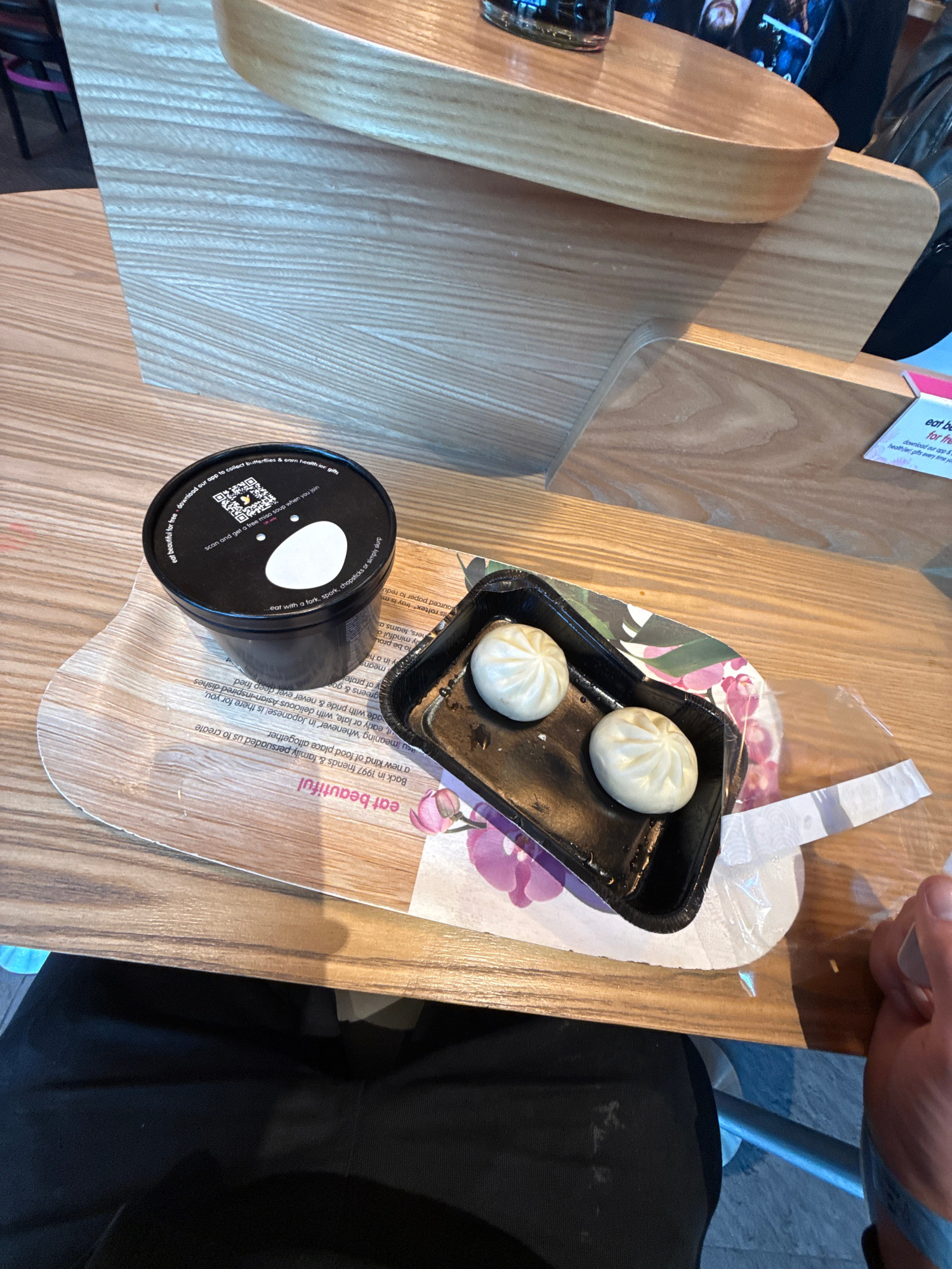 The image captures a top-down view of a table setting in what appears to be an Eat Beautiful restaurant, identifiable by the placemat and branding. There are two buns in a black container, beside a bl…read more