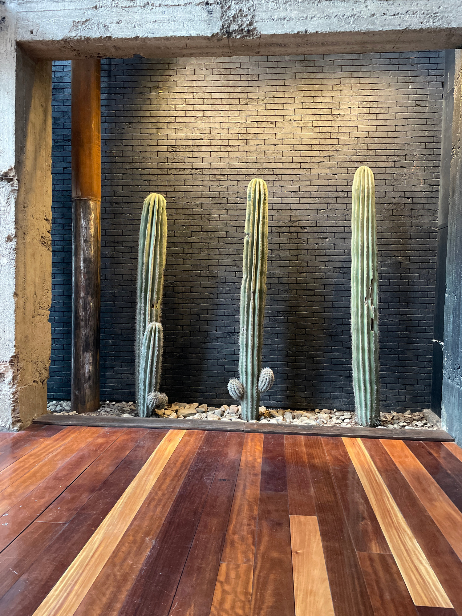 The image shows an interior design element in Tbilisi, Georgia, featuring three elongated cacti planted in a rectangular alcove. The alcove's back wall is constructed of dark, vertically stacked brick…read more