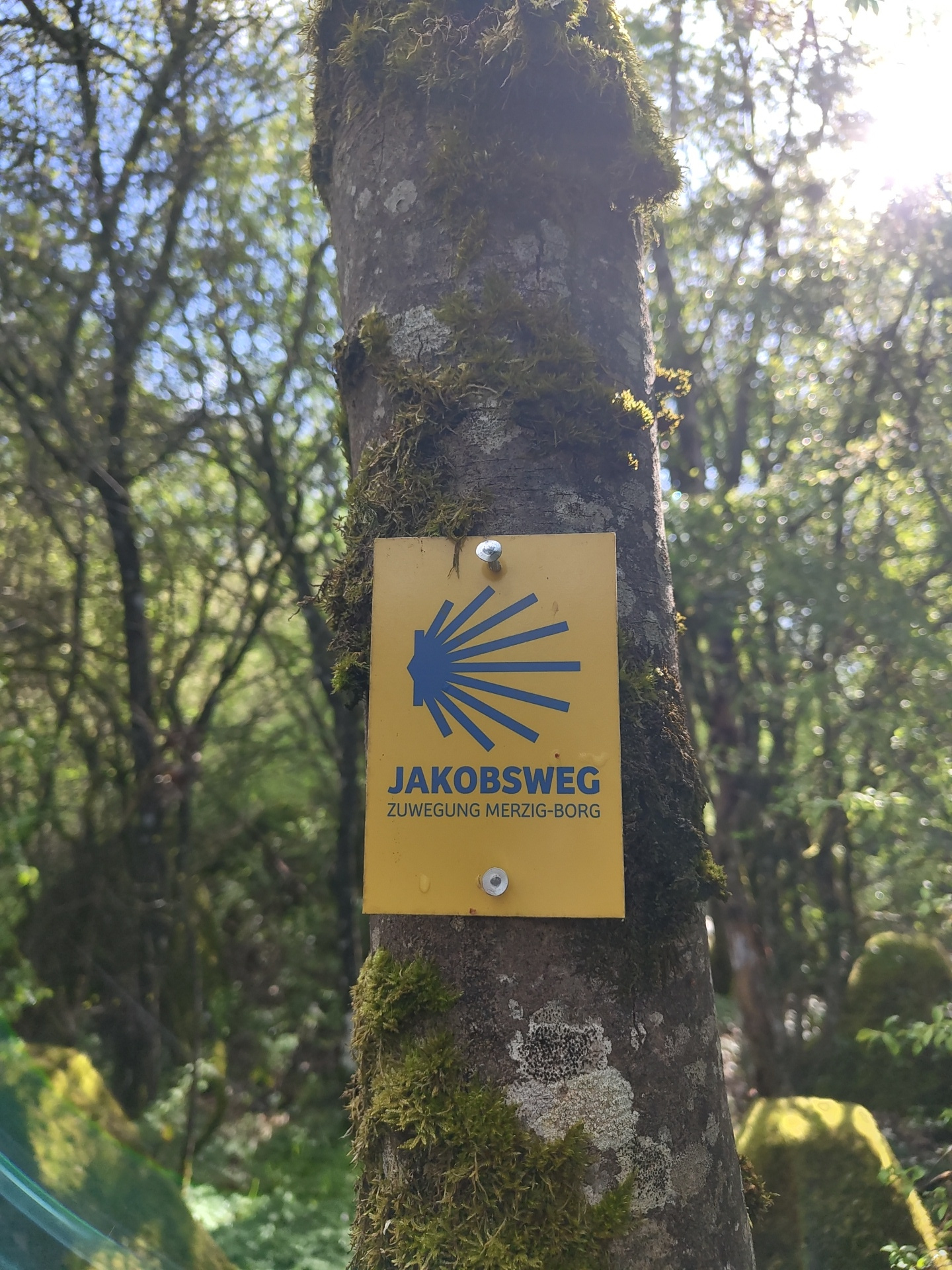 A yellow sign on a tree trunk marks the "Jakobsweg" hiking trail near Mettlach, Germany. The sign features a blue scallop shell symbol and text indicating the trail's name. Moss covers portions of the…read more