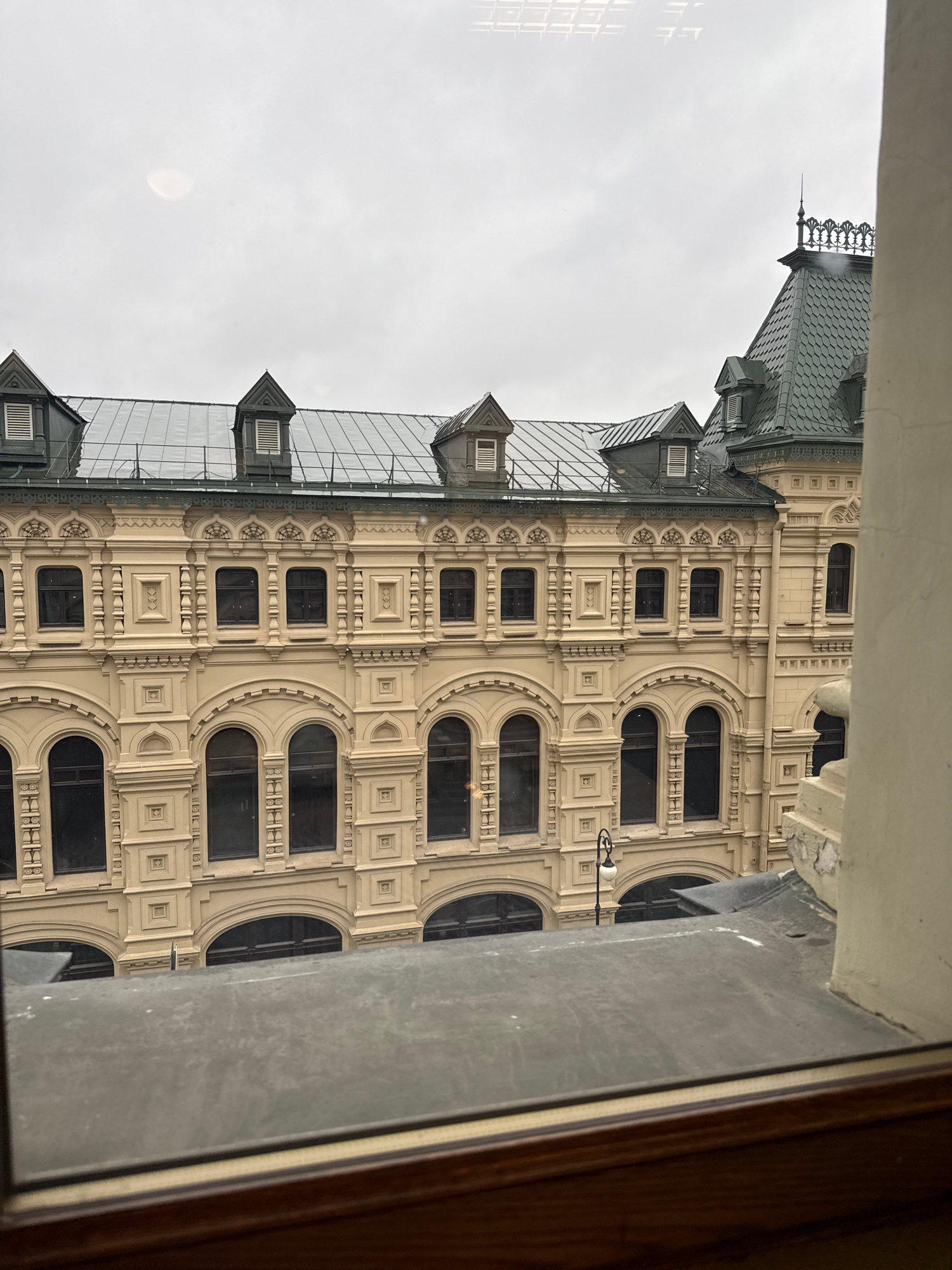 From a window perspective, the image captures the exterior facade of the GUM department store in Moscow, Russia. The building features a symmetrical design with multiple floors, ornate detailing, arch…read more