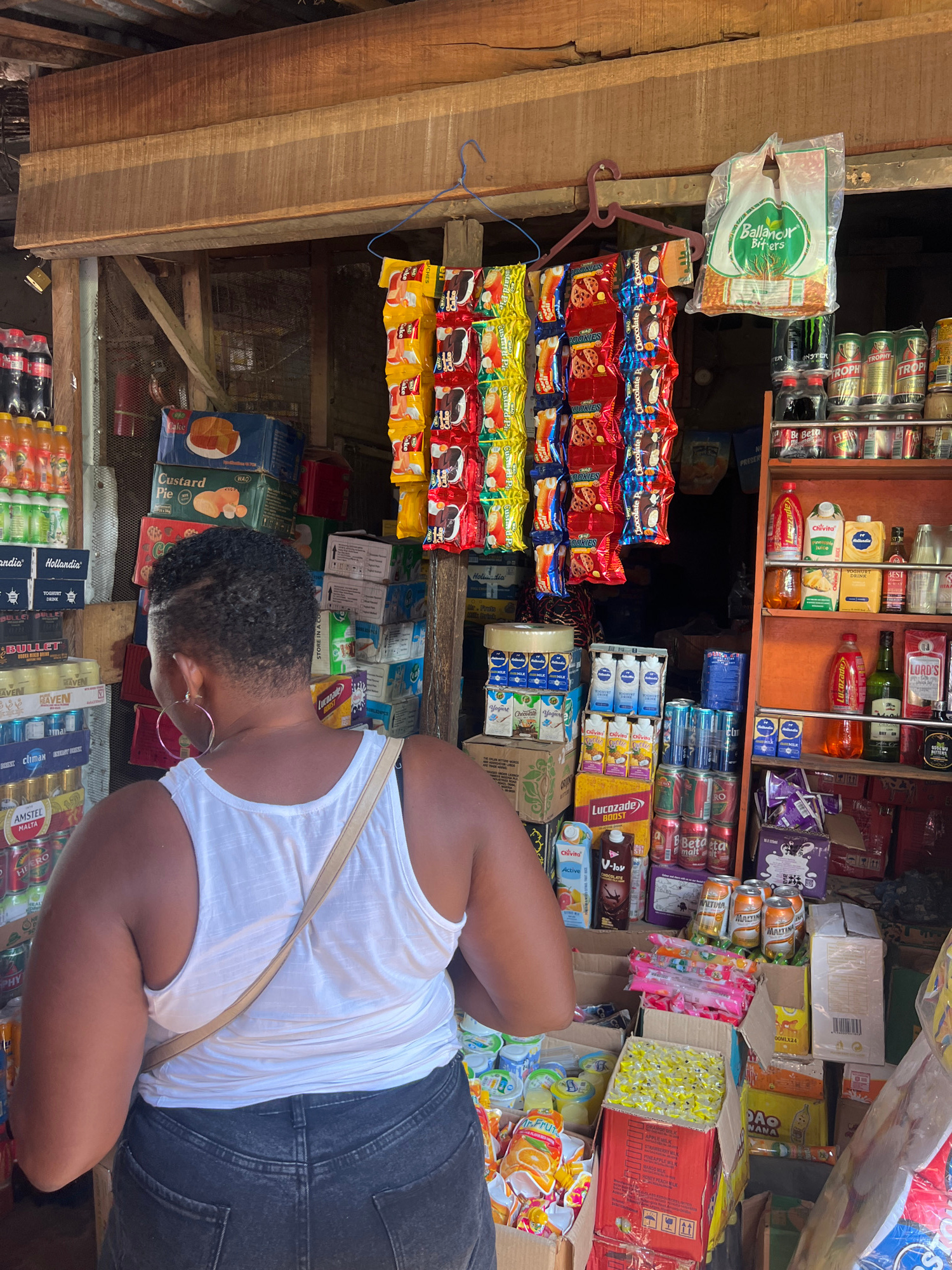 A woman with short dark hair, wearing a white tank top and dark jeans, stands examining a shop stall in Nkpor, Nigeria. She wears hoop earrings and has a purse strap across her chest. The shop is stoc…read more