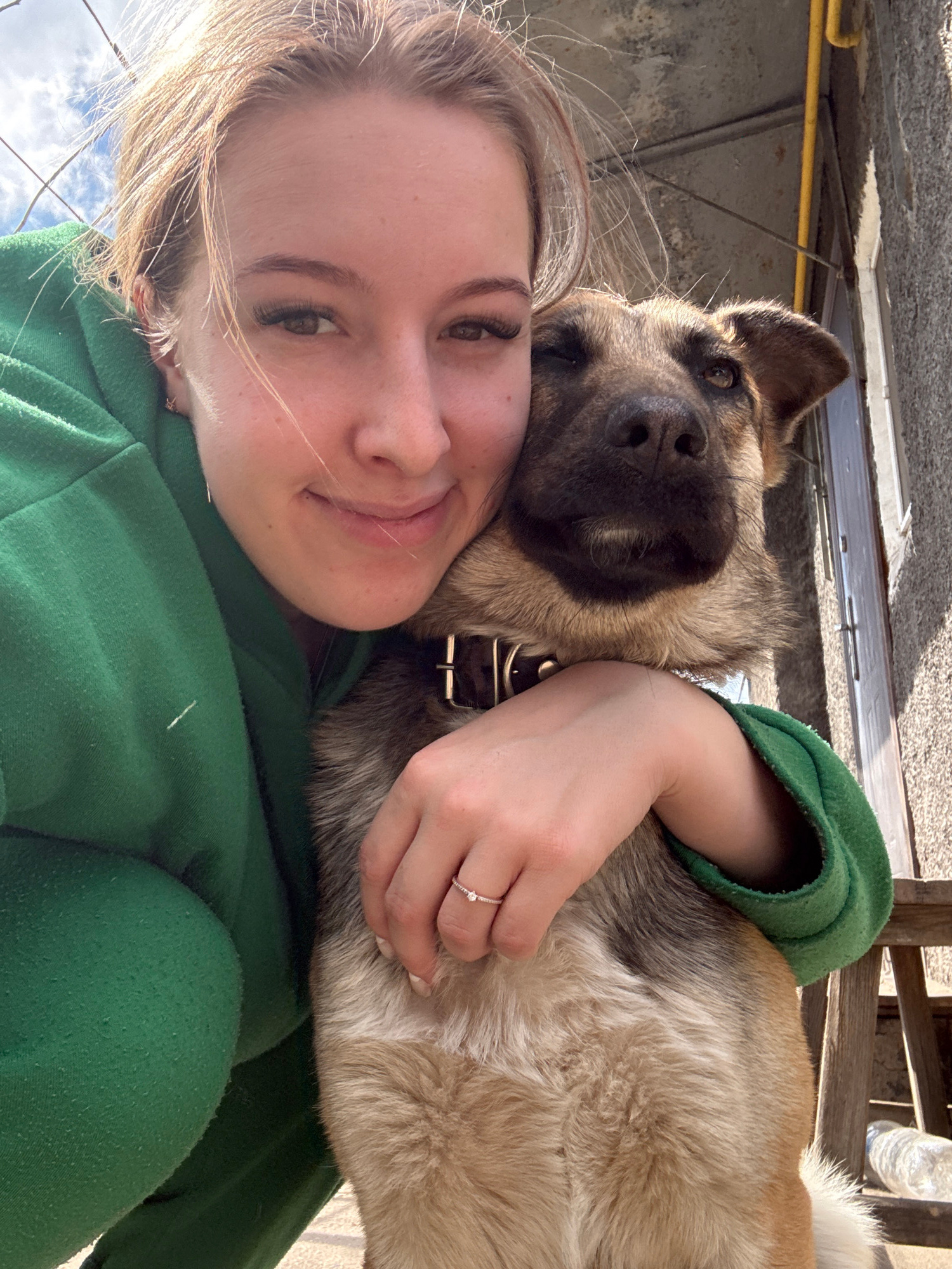 A woman is holding a dog in an outdoor location. The woman is wearing a green hoodie and has light-colored hair. She is smiling at the camera. The dog is brown and tan, with a black collar. The woman'…read more