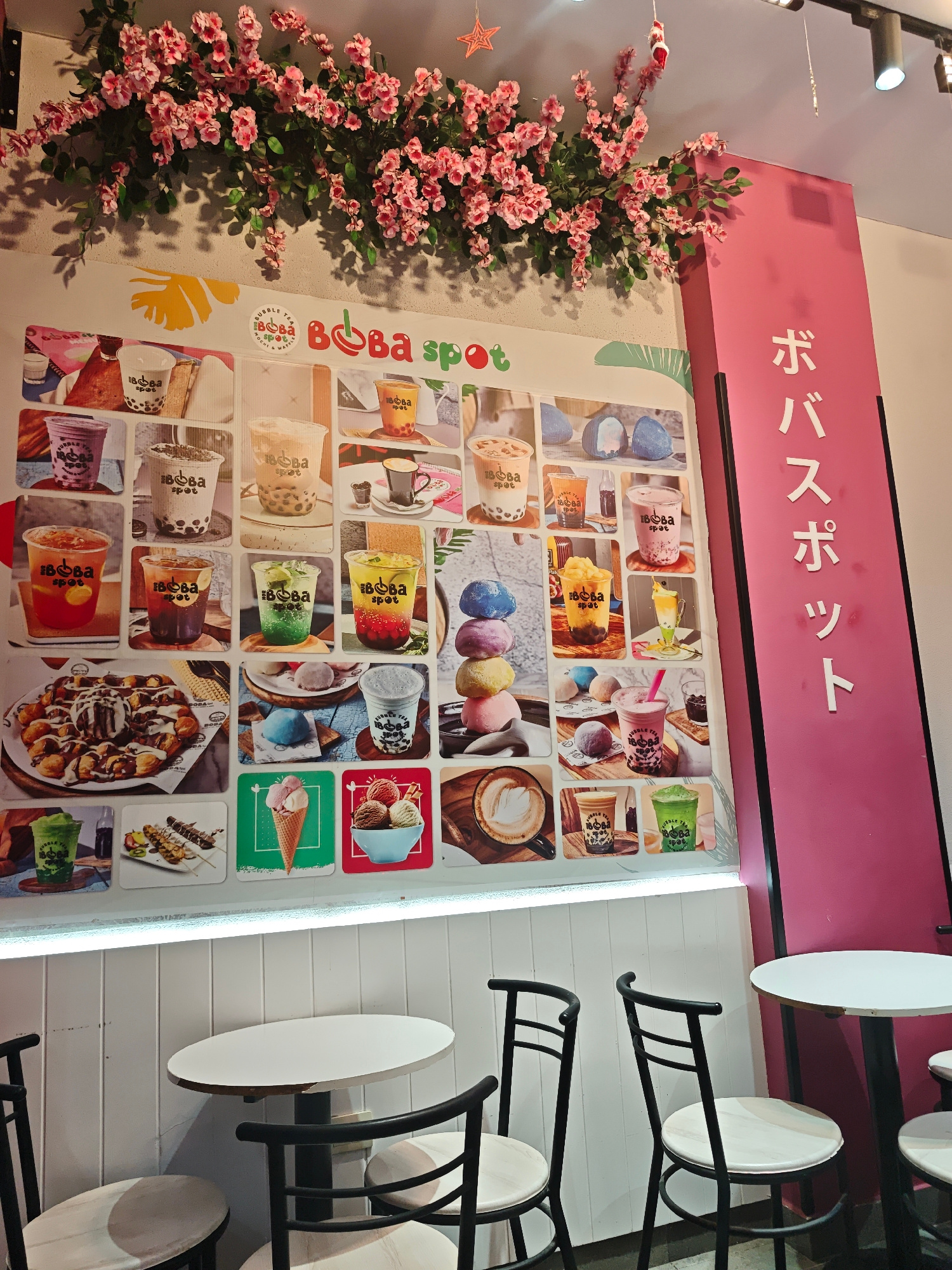 The image shows the interior of a Boba Spot, likely a bubble tea shop, in Hurghada, Egypt. A large menu board displays colorful images of boba drinks, desserts, and ice cream. The sign "Boba Spot" i…read more