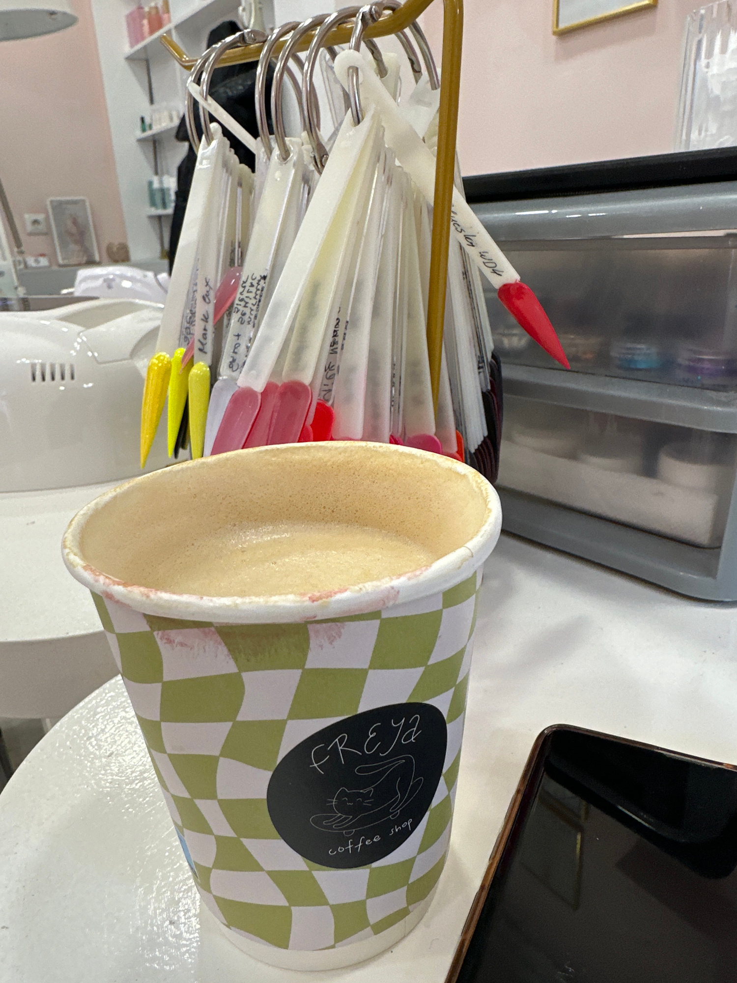 An overhead, slightly angled shot captures a detail-rich scene within what appears to be a nail salon in Sofia, Bulgaria. The primary subjects are a collection of nail polish color swatches and a pape…read more