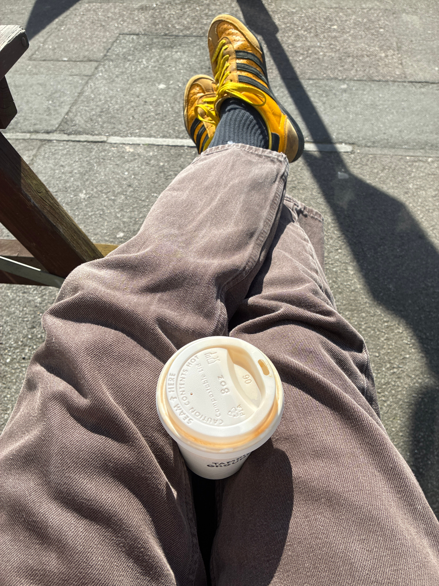 The image shows a person sitting outdoors in bright sunlight, presumably in a public space. The person is wearing brown pants and yellow Adidas Samba sneakers with black stripes, paired with grey sock…read more