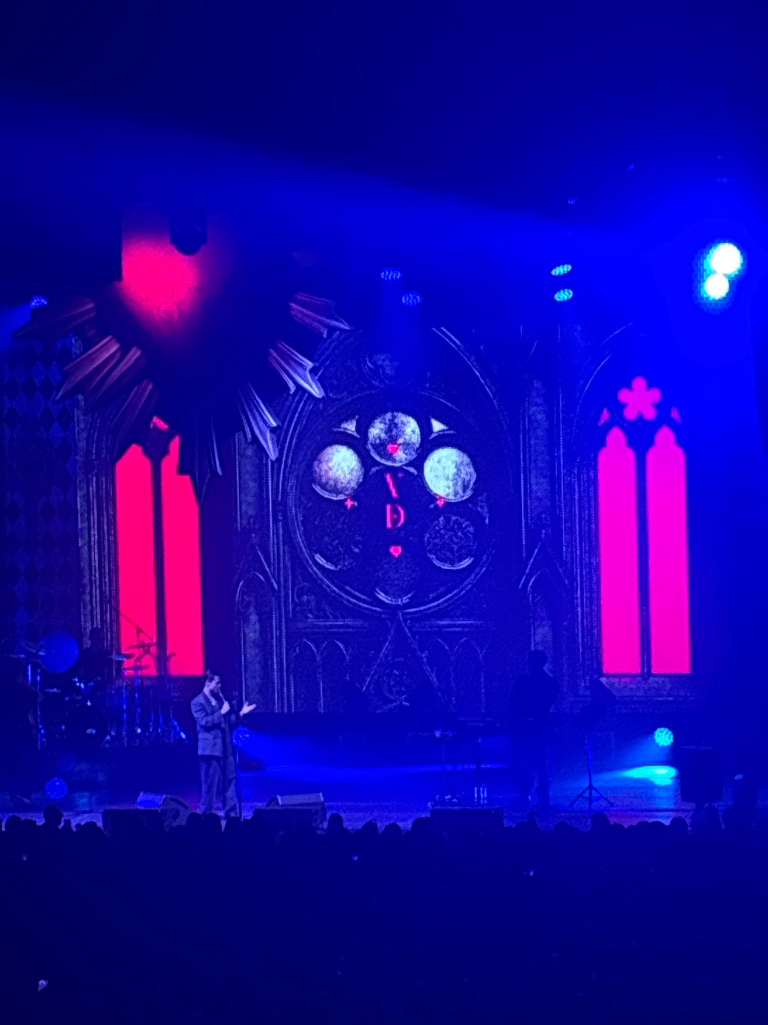 The image shows a stage set, potentially a theater or concert venue, in what may be the city of Perm, Russia. The central element is a large, dark-colored, multi-tiered structure with gothic-inspired…read more