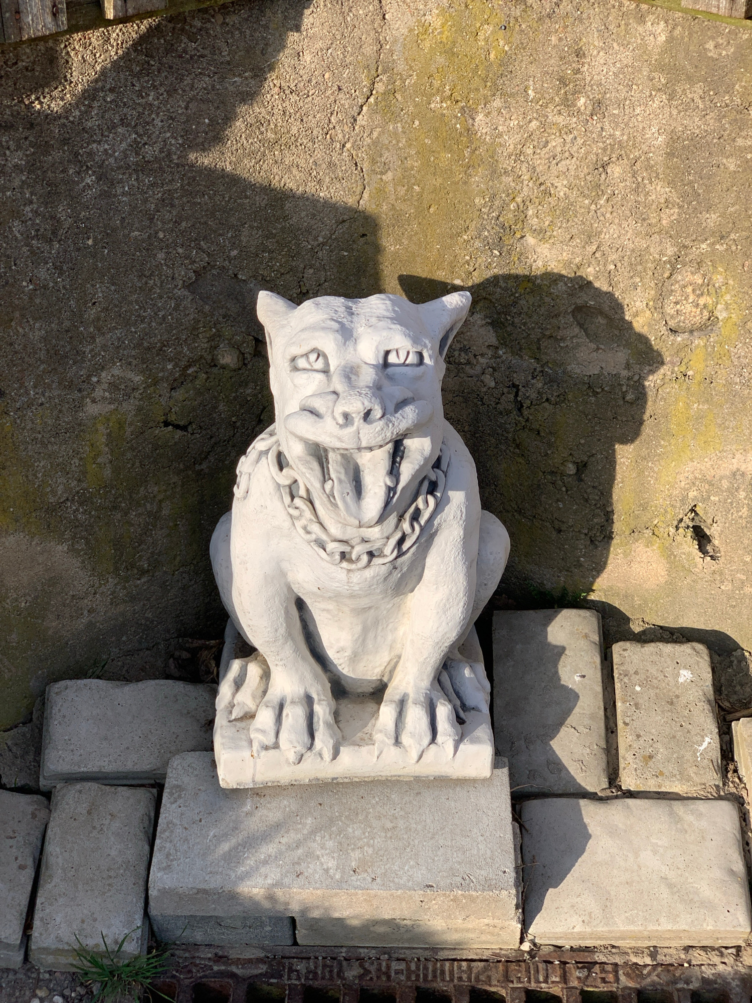 The image depicts a white, concrete statue of a snarling dog with a chain around its neck, lying on its side. The statue is positioned on a surface of cracked, gray concrete, with a pile of rectangula…read more