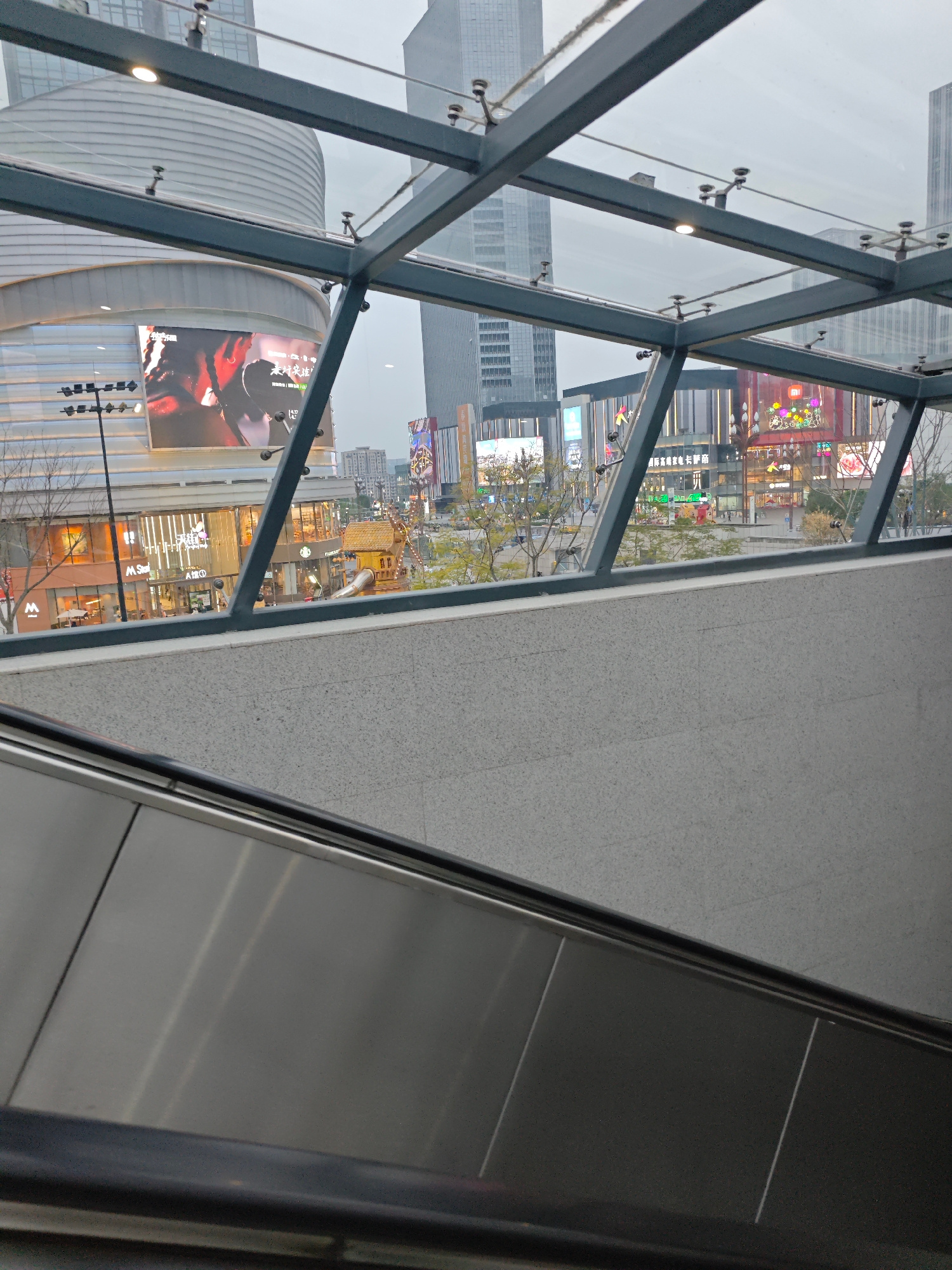 The image shows a view from an escalator in Liangjiang, China. A large, modern building with a curved, multi-layered facade and a large video screen is visible through a glass and steel canopy structu…read more