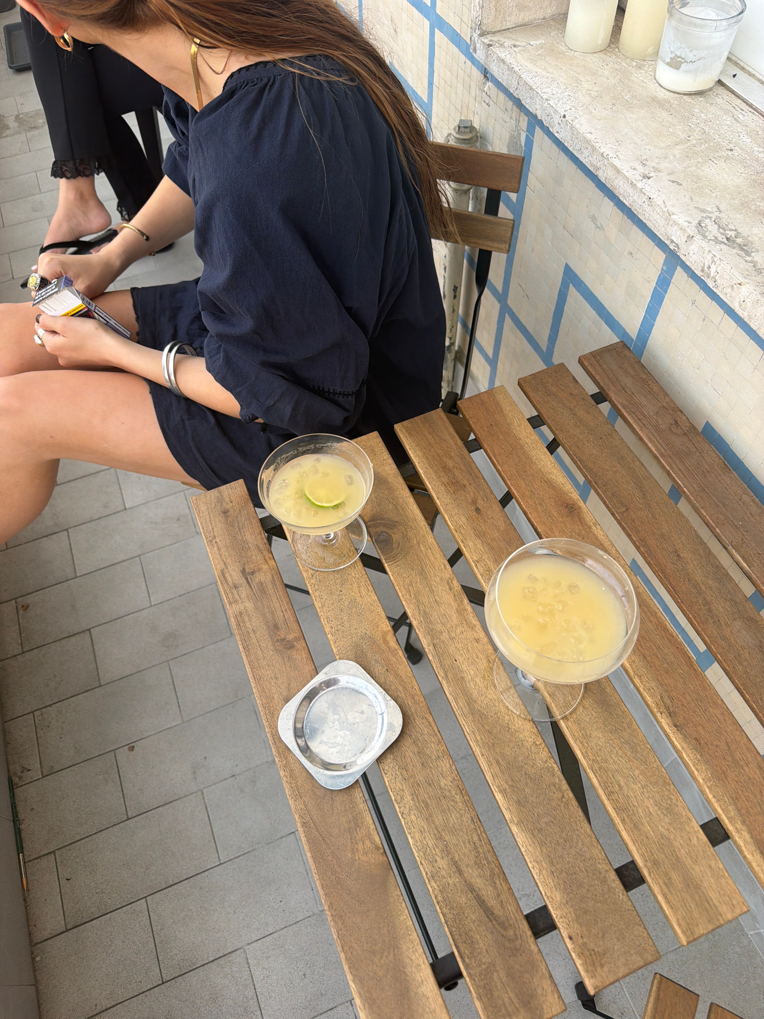 The image captures an overhead view of a person seated at a wooden table on a terrace. The person is wearing a dark blue, loose-fitting top and dark pants. They are holding a small object, possibly a…read more