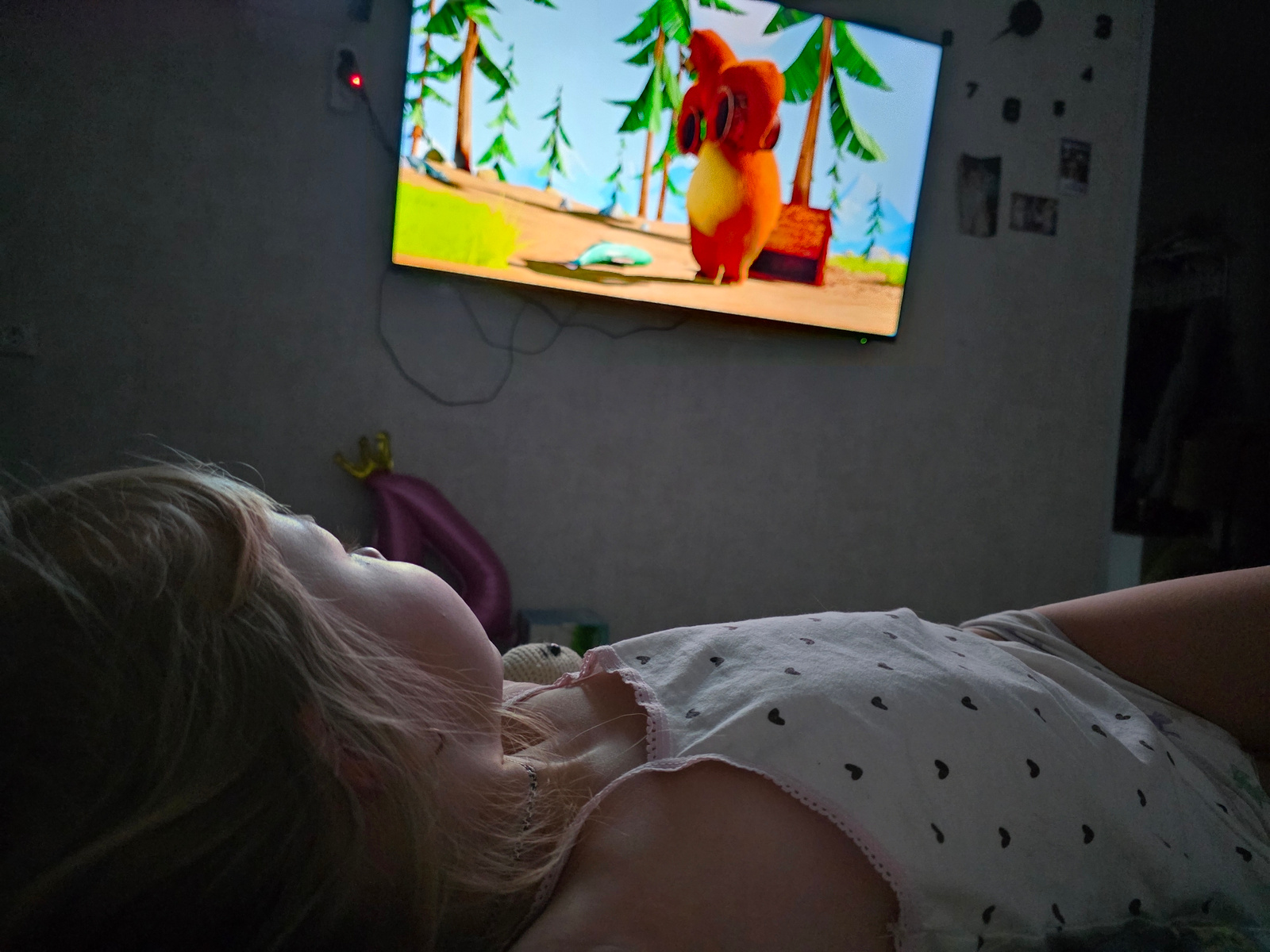 A young, fair-skinned child with blonde hair lies on a bed. The child's head is turned upwards, facing a wall-mounted television displaying an animated cartoon with a red, fuzzy character in a tropica…read more
