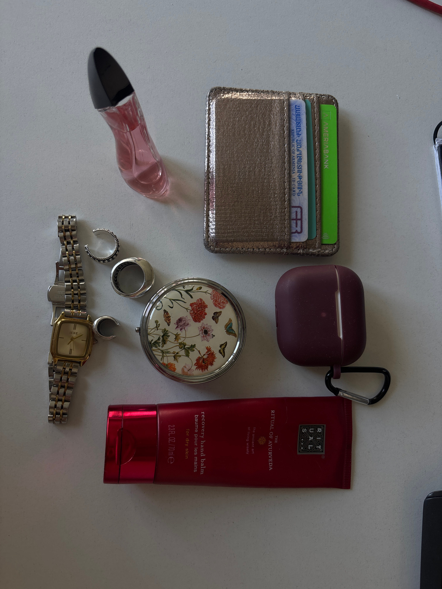 A flat lay photograph features various personal items arranged on a light-colored surface. At the top left, a metallic wallet with cards is visible, including one from "AMERIABANK" and an Armenian ID…read more