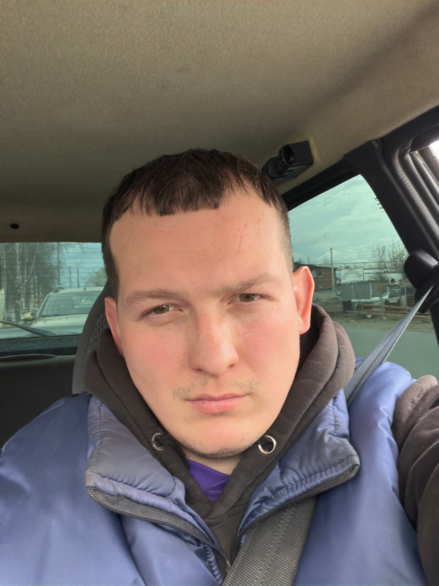 A young man is depicted in a close-up, selfie-style portrait, positioned inside a vehicle in Chaikovsky, Russia. He has light skin, short dark brown hair, and green or hazel eyes, looking directly at…read more