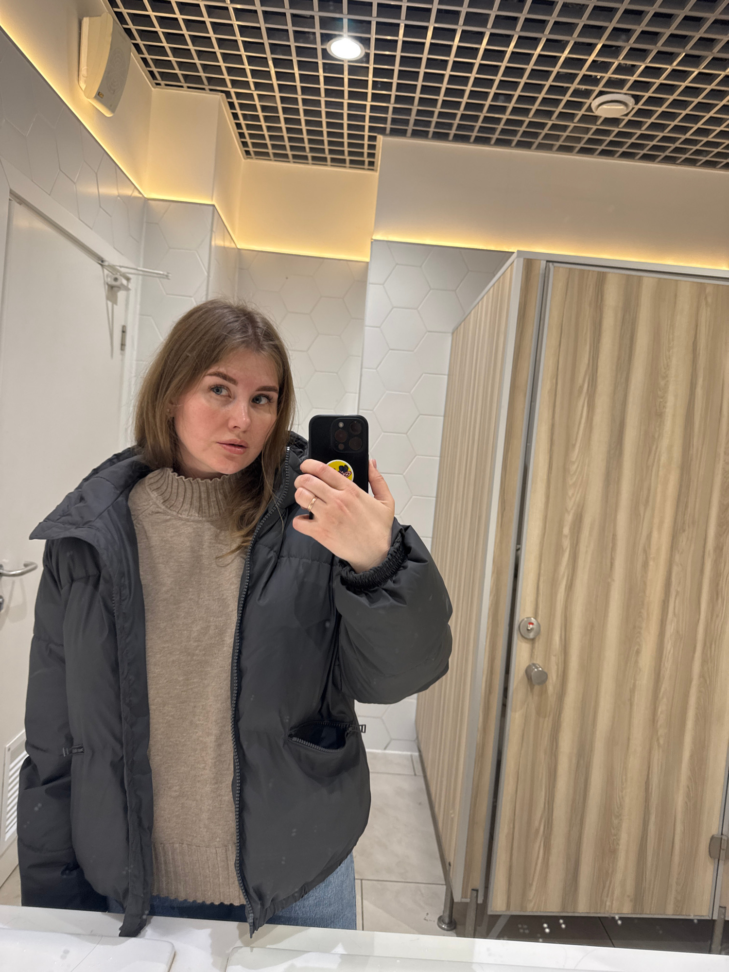 The photograph appears to be a selfie taken in a public restroom. The subject is a woman with light brown hair wearing a tan sweater and a black puffer jacket. She is holding a black smartphone in her…read more