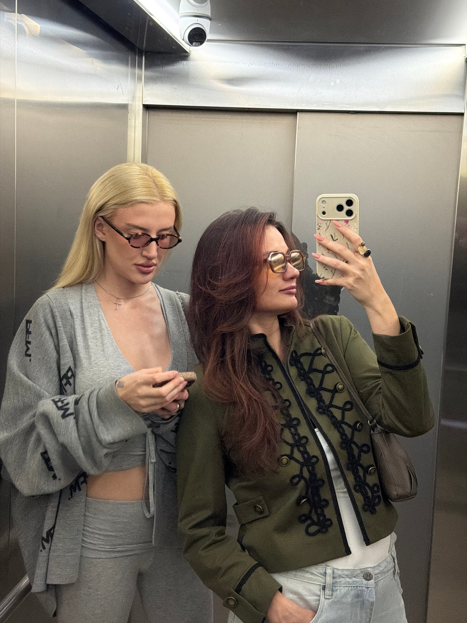 Two women are positioned in what appears to be the reflection of an elevator. The woman on the top, with dark hair and eyeglasses, is holding a smartphone taking a photo. She is wearing an olive green…read more