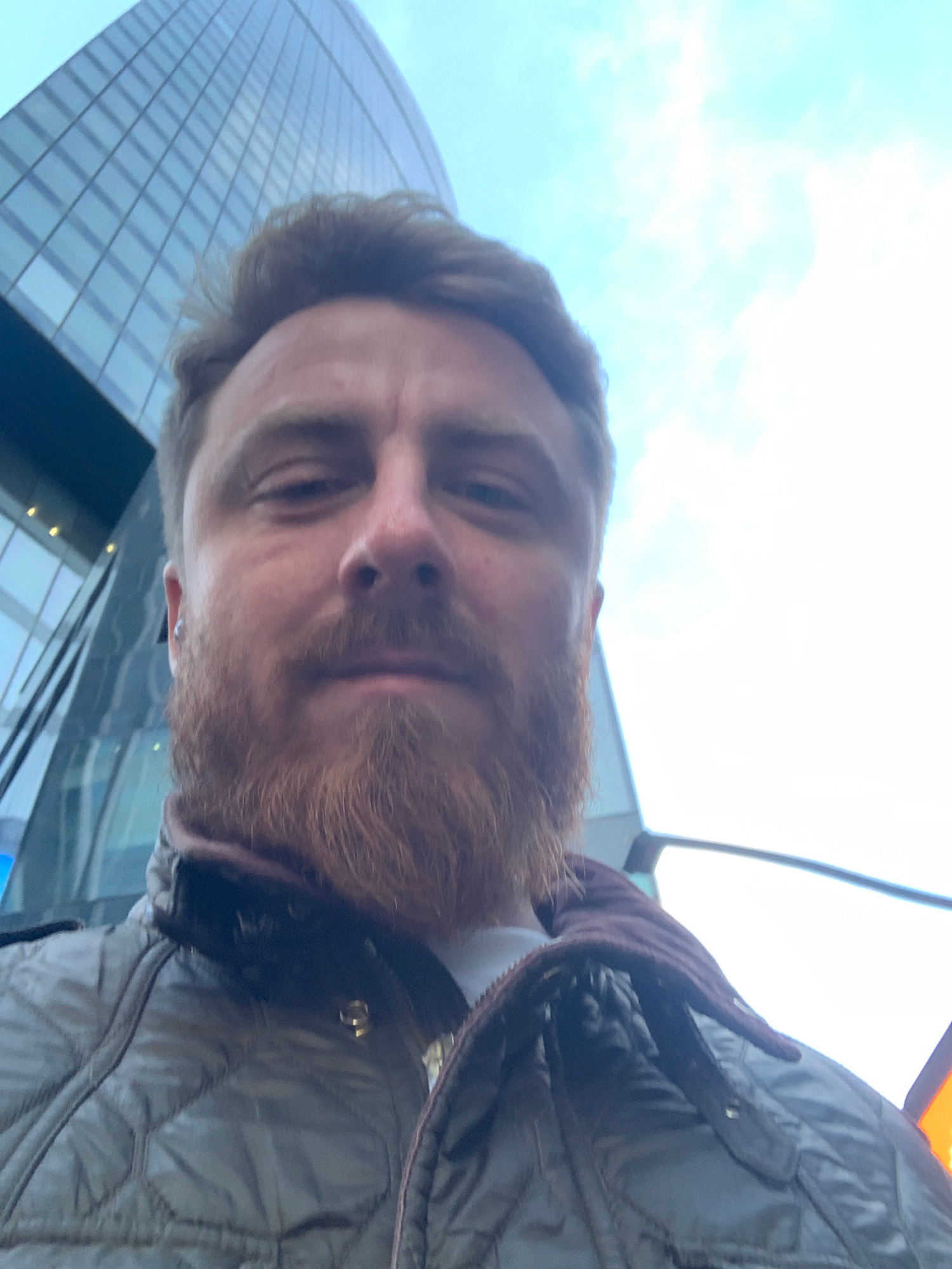 A selfie taken from a low angle features a man with light skin, light brown hair, and a ginger beard. He is wearing a quilted jacket, possibly grey or olive green, with a brown collar. Behind him, a t…read more
