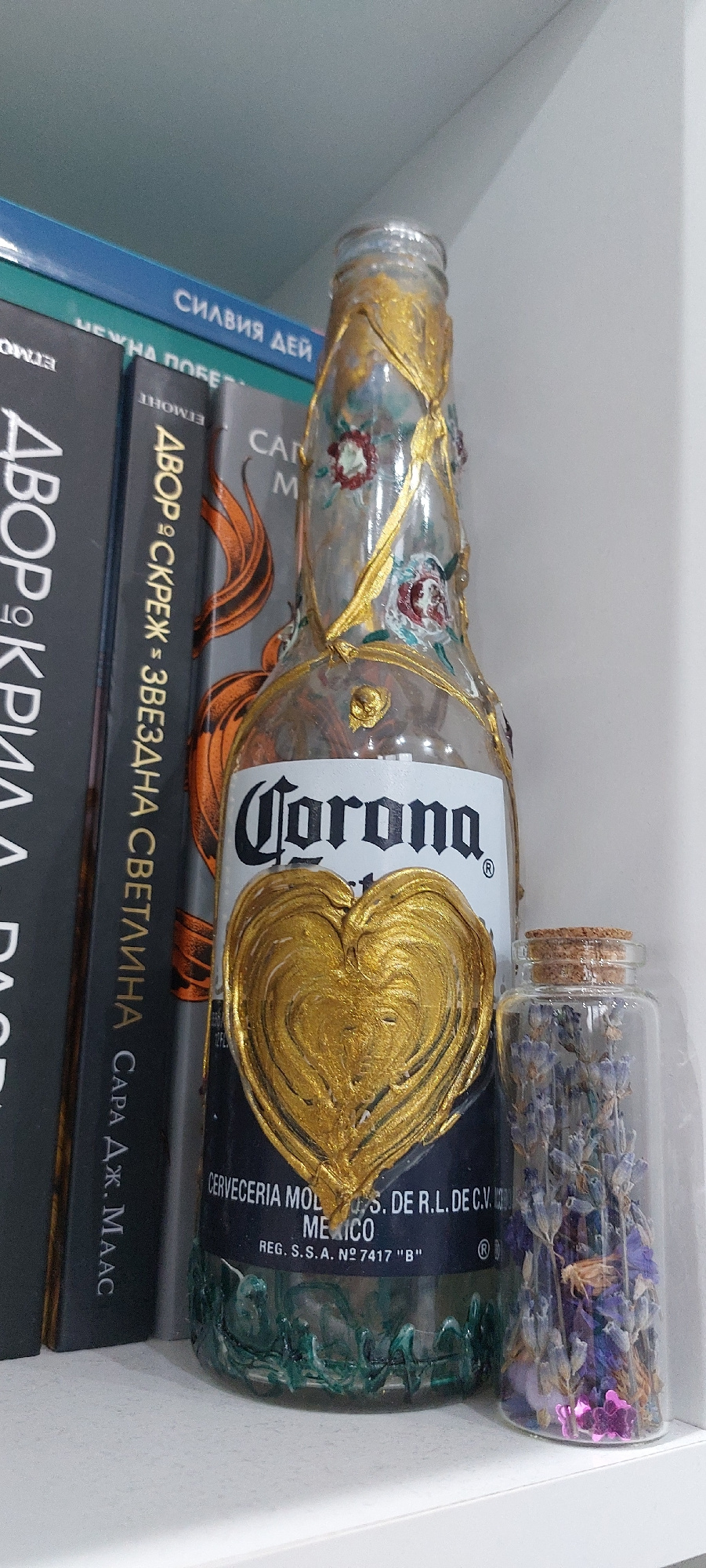 The image displays a creatively decorated Corona beer bottle resting horizontally on a stack of books, positioned on a white shelf in Yagodovo, Bulgaria. The clear glass bottle is adorned with elabora…read more