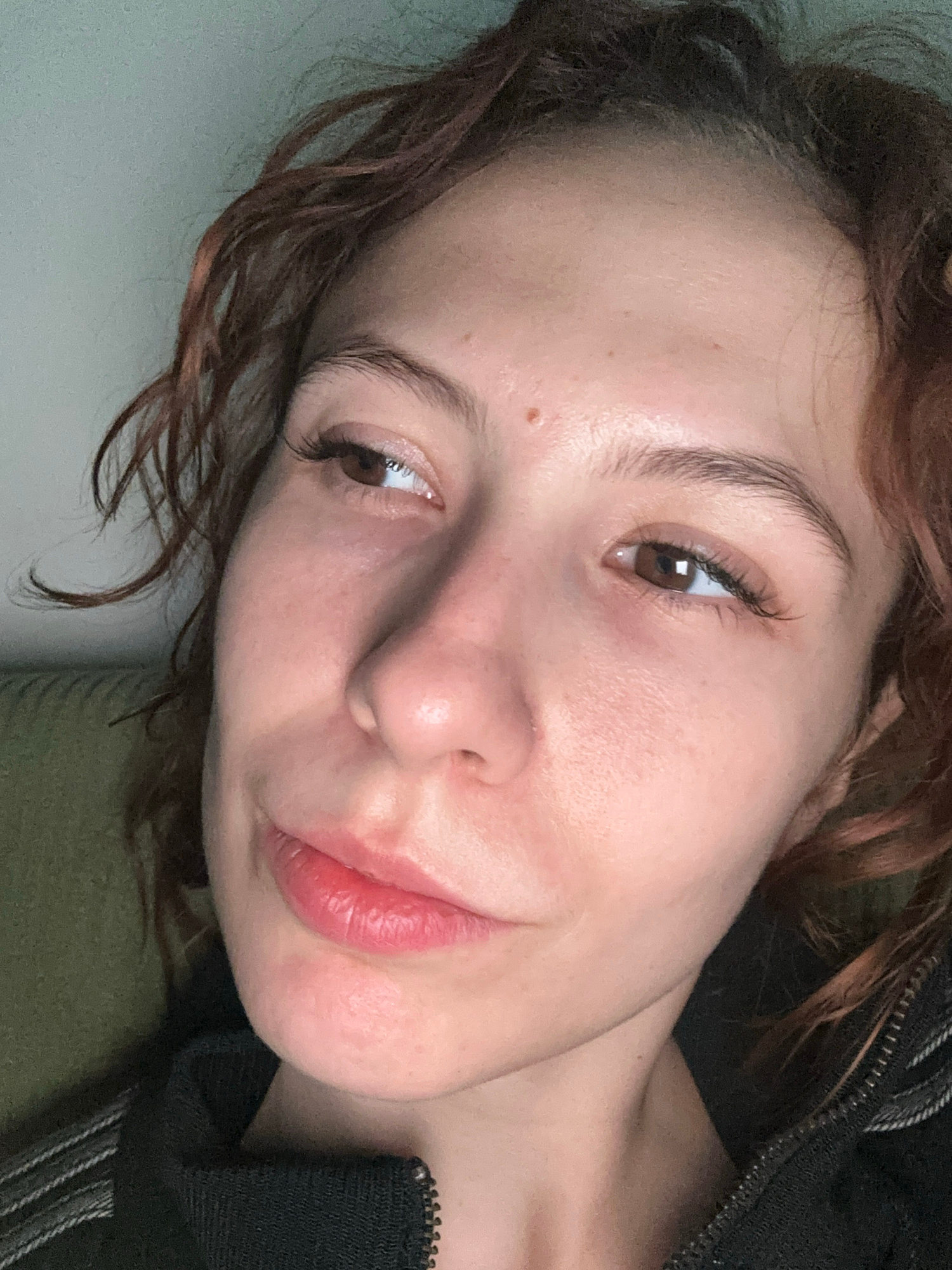A close-up, angled portrait shows a person with light skin, brown eyes, and reddish-brown curly hair. A mole is visible on the upper left cheek. The person is wearing a dark-colored garment with a zip…read more