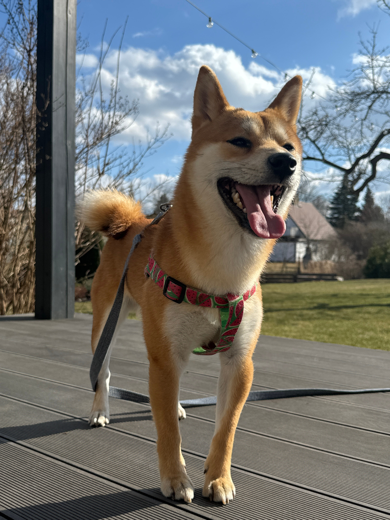 A medium shot depicts a Shiba Inu dog, with a reddish-brown coat and white markings on its face and chest, standing on a dark gray wooden deck. The dog is wearing a harness with a watermelon pattern.…read more