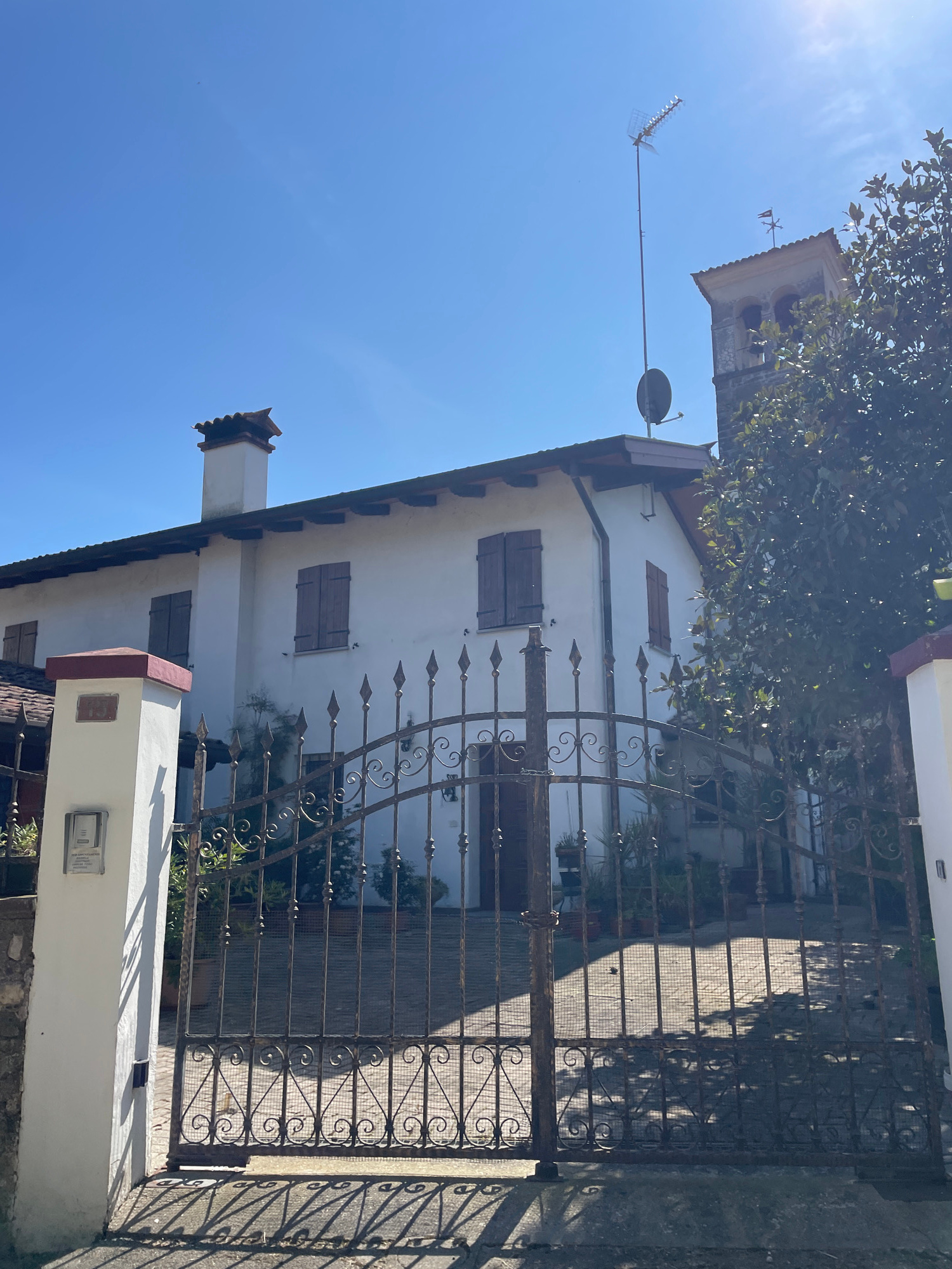 A low-angle shot shows a white, multi-story building with brown shutters behind a wrought-iron gate in San Lorenzo, Italy. The building has a satellite dish and antenna on its roof. A church tower is…read more