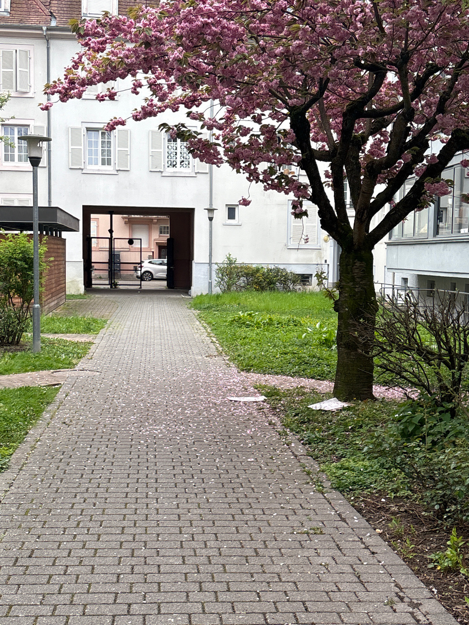 A ground-level perspective reveals a tree with pink blossoms along a brick walkway in Schiltigheim, France. The walkway leads to a tunnel or open passageway between buildings, with a glimpse of a car…read more