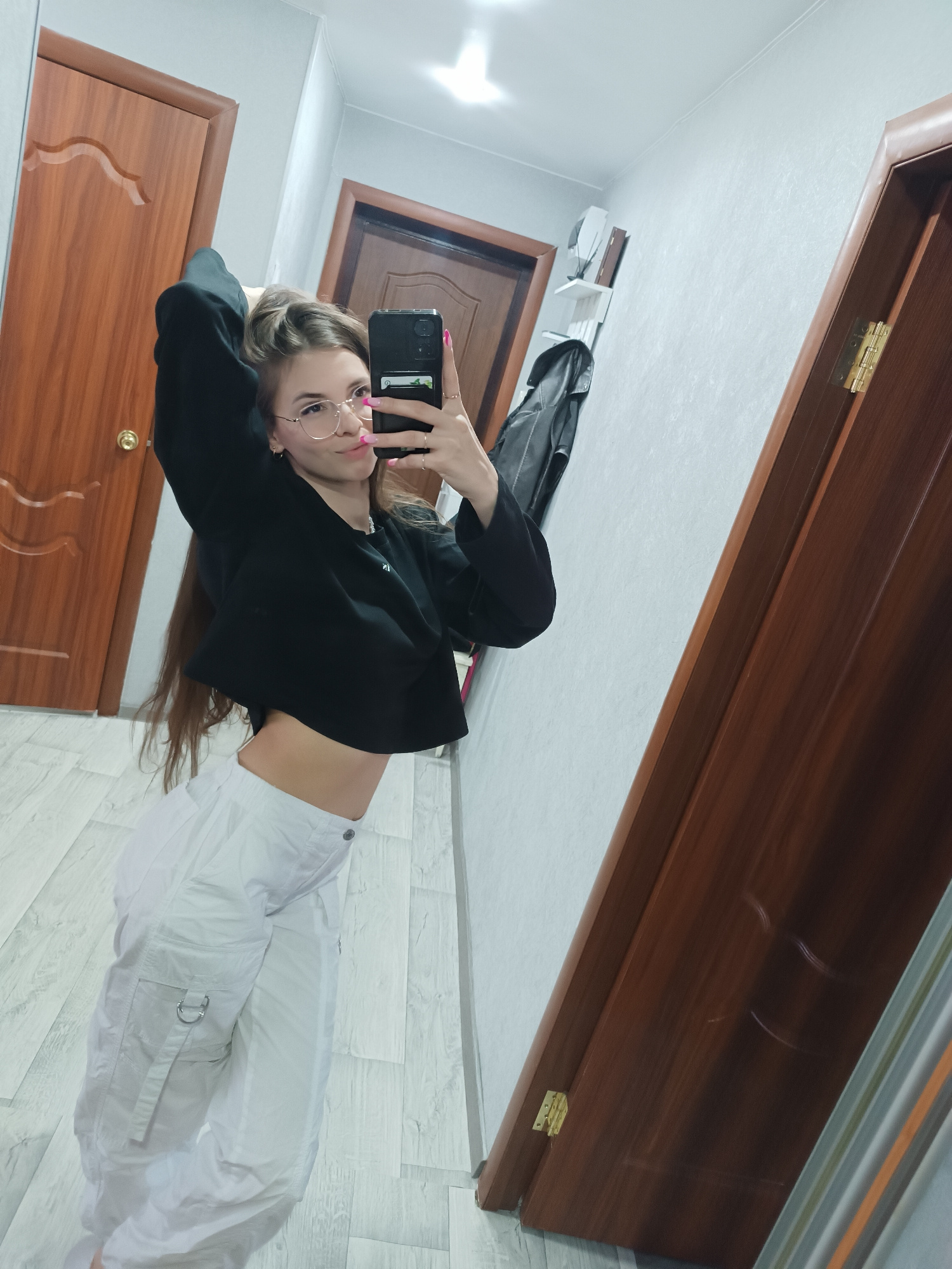 A young woman is taking a selfie in what appears to be an indoor hallway or small room. She is wearing round-rimmed glasses, a black cropped long-sleeve shirt, and white cargo pants. Her hair is long…read more