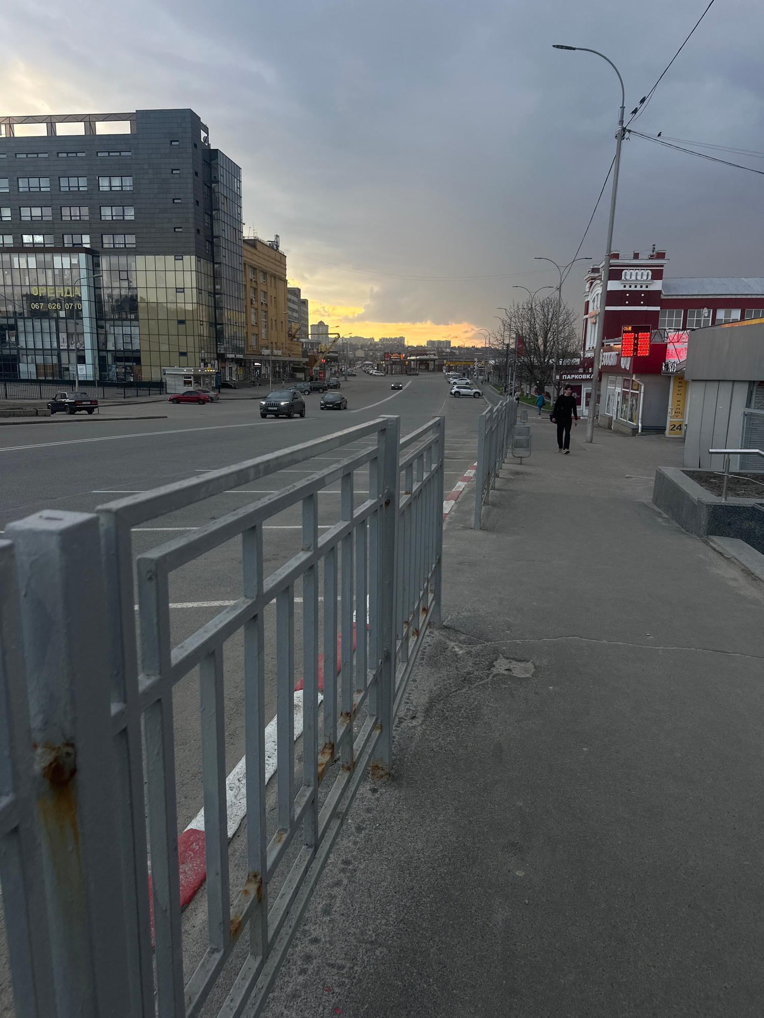 The image shows an elevated view of a street in Kharkiv, Ukraine, at sunset. A gray metal fence runs along the right side of the frame, partially obscuring the street and sidewalk below. The road has…read more