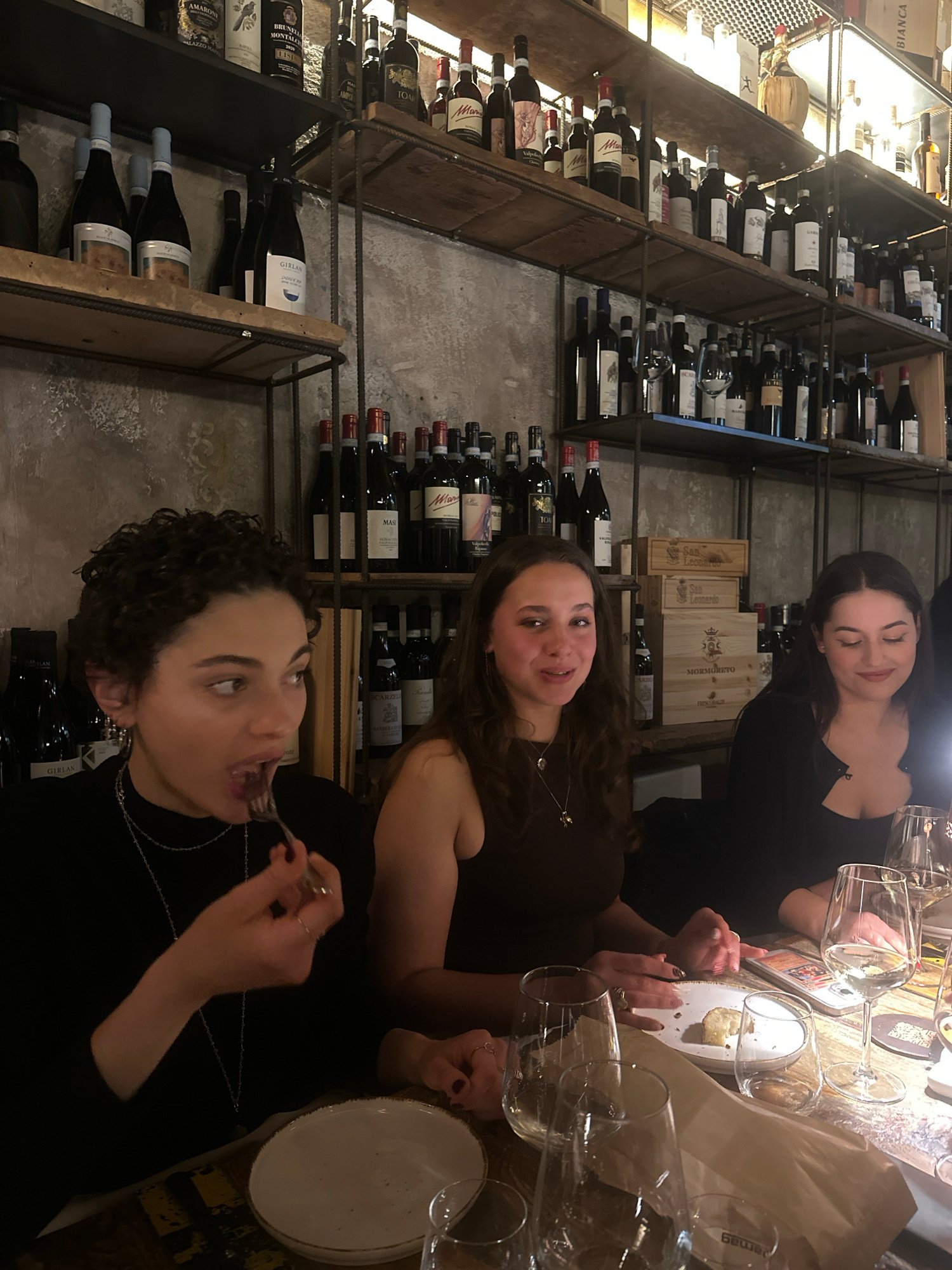 Three young adult women are seated at a distressed wooden table in a dimly lit Italian restaurant or wine bar, characterized by concrete-like textured walls and extensive industrial-style shelving dis…read more