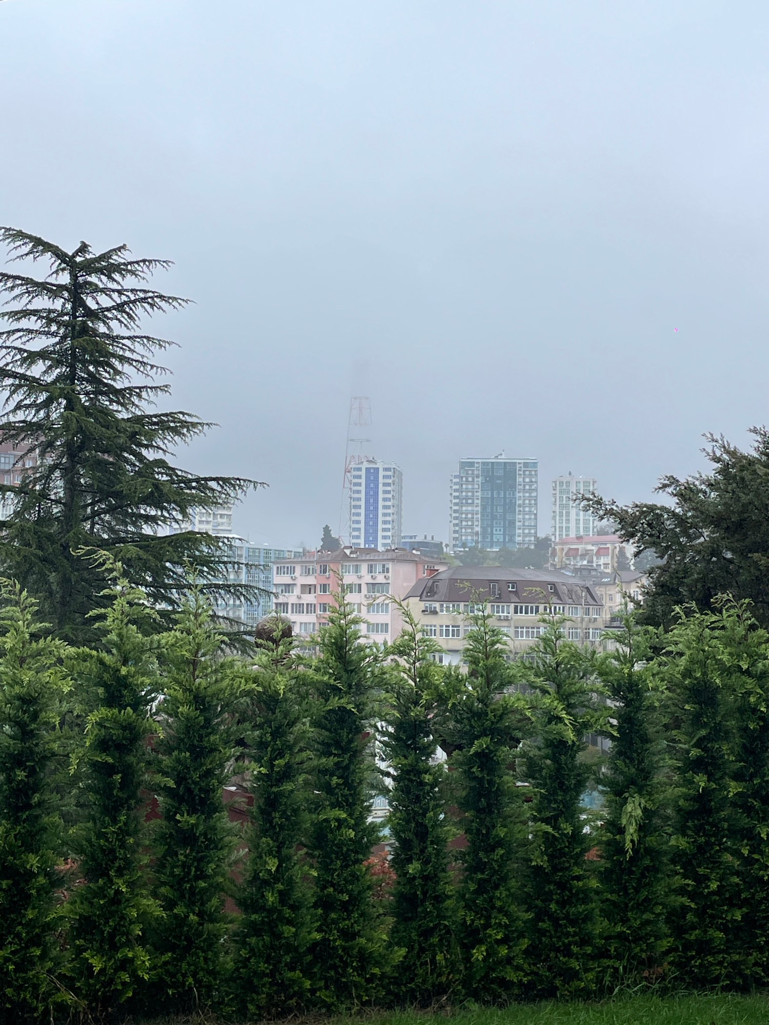 The image presents a view of Sochi, Russia, partially obscured by fog and foliage. The focus is on the urban landscape, where a mix of residential and commercial buildings, including high-rise structu…read more