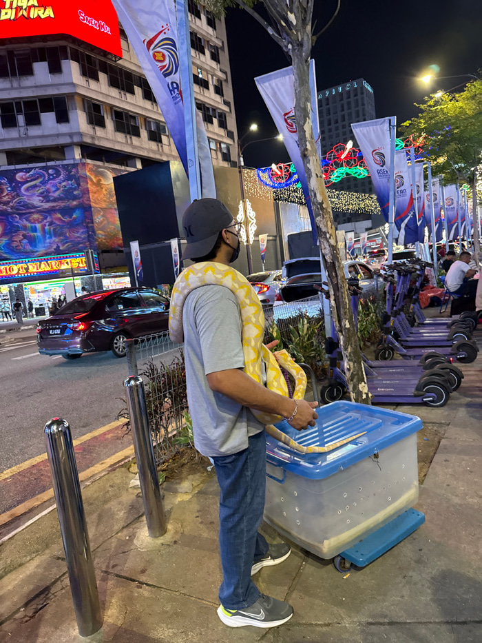 The image captures a nighttime street scene on Jalan Bukit Bintang, Kuala Lumpur, Malaysia. A male subject stands on a concrete sidewalk, viewed from behind and angled slightly to his right. He wears…read more