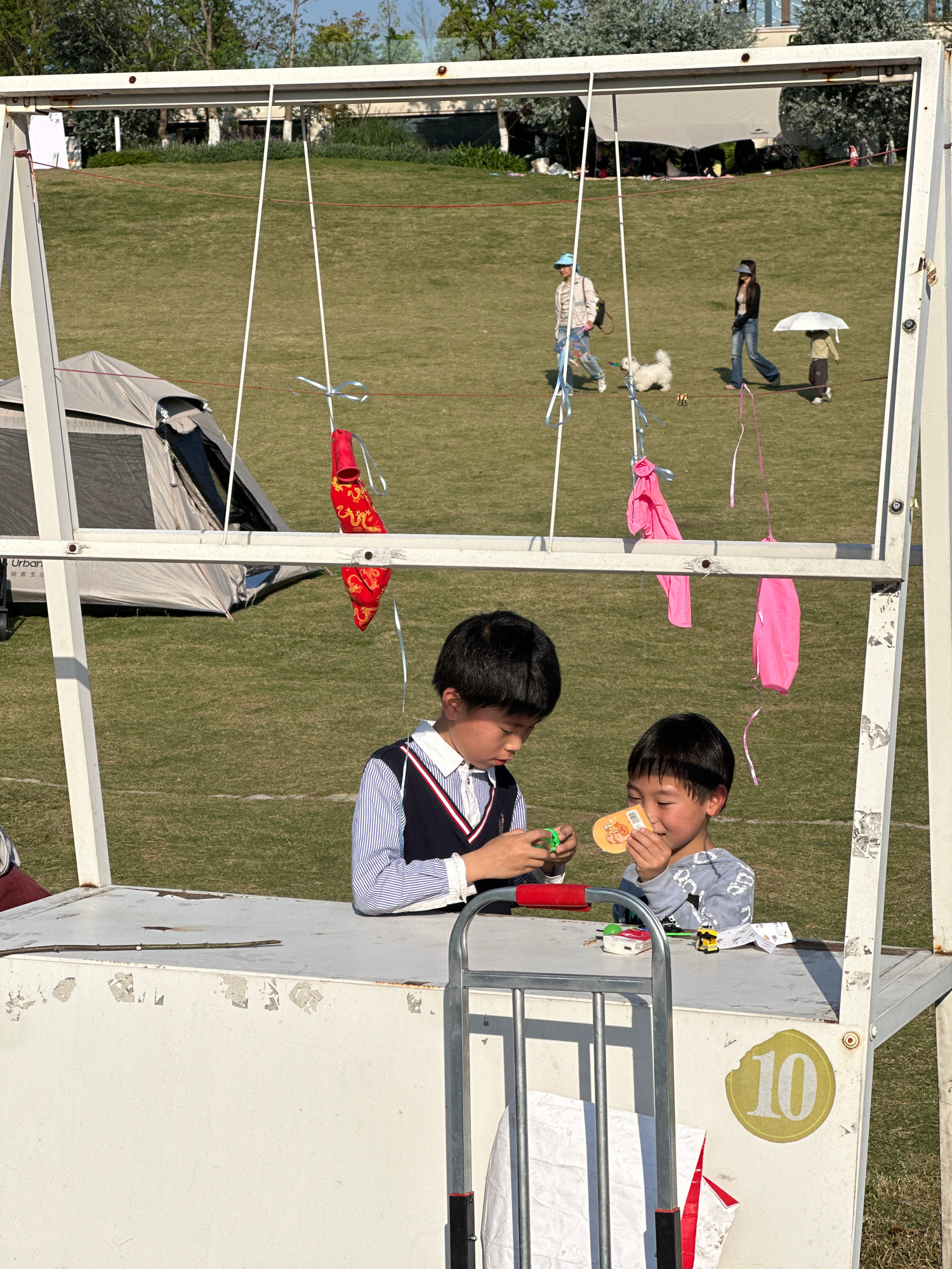 The image depicts two young boys standing in what appears to be a raised platform or structure. One boy is holding a small, round container and looking down at it, while the other is holding a package…read more