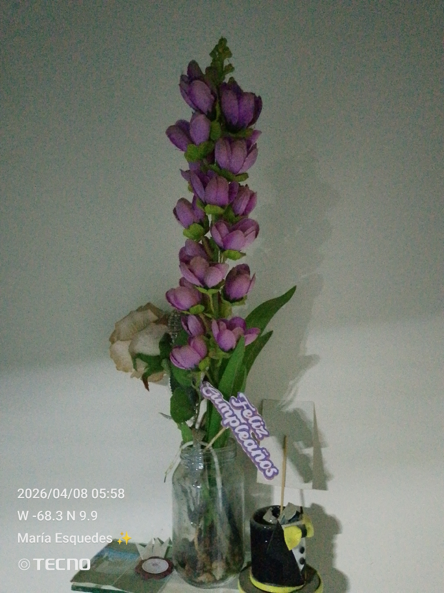 The image shows a floral arrangement consisting of purple flowers and a single white rose in a glass jar. A "Feliz Cumpleaños" sign is placed amongst the flowers. To the right of the jar, a small deco…read more