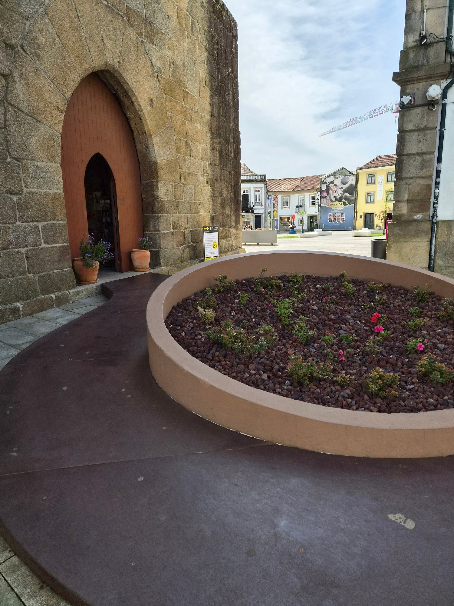 The image depicts a scene in Barcelos, Portugal. A large, circular flower bed containing stones and vegetation occupies the right side of the frame. Adjacent to the left, there's an ancient building w…read more