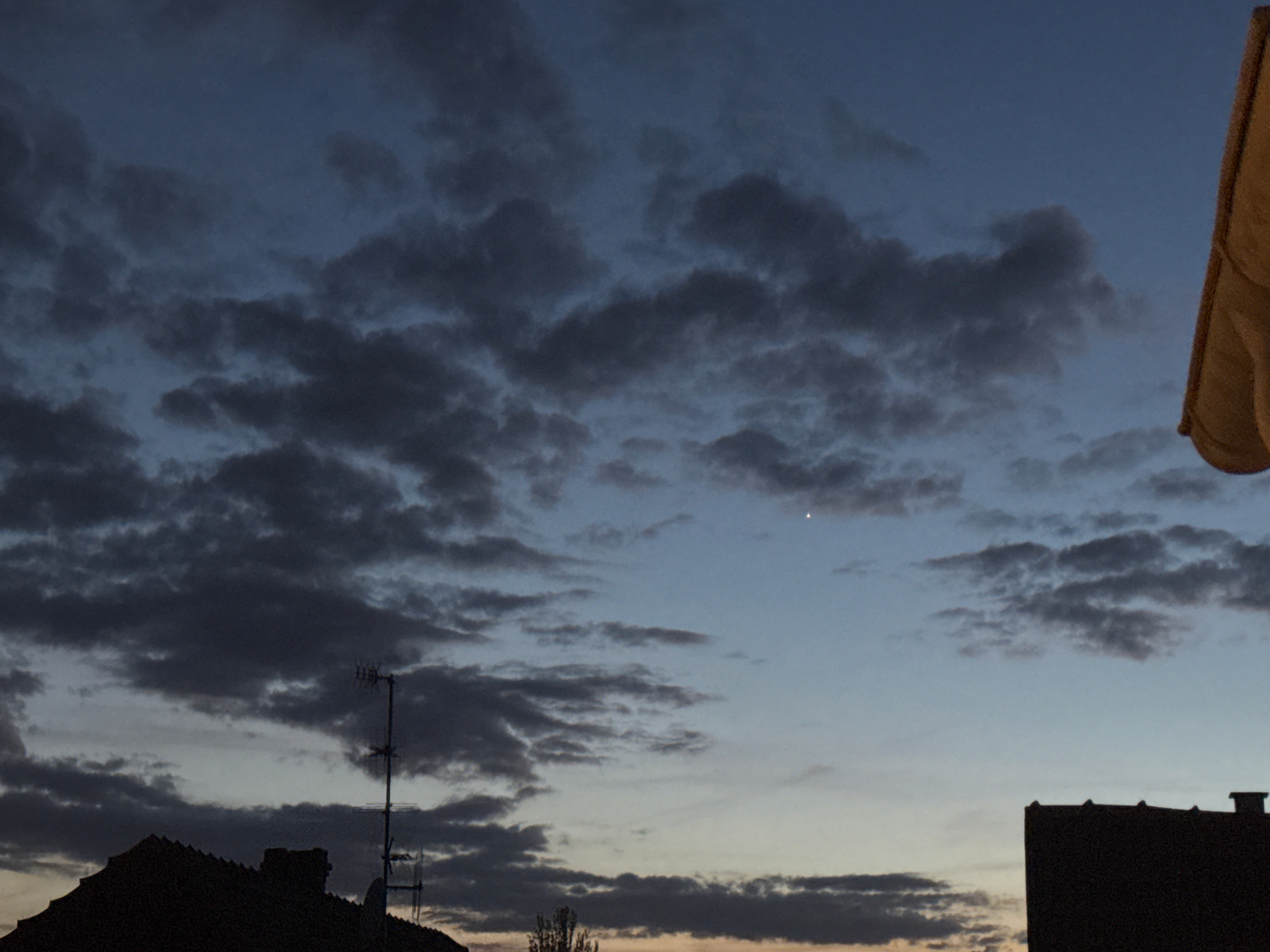 The image displays a twilight sky over Bischheim, France, characterized by a gradient of color, transitioning from a deep indigo blue at the top to lighter, more desaturated blue and faint peach tones…read more