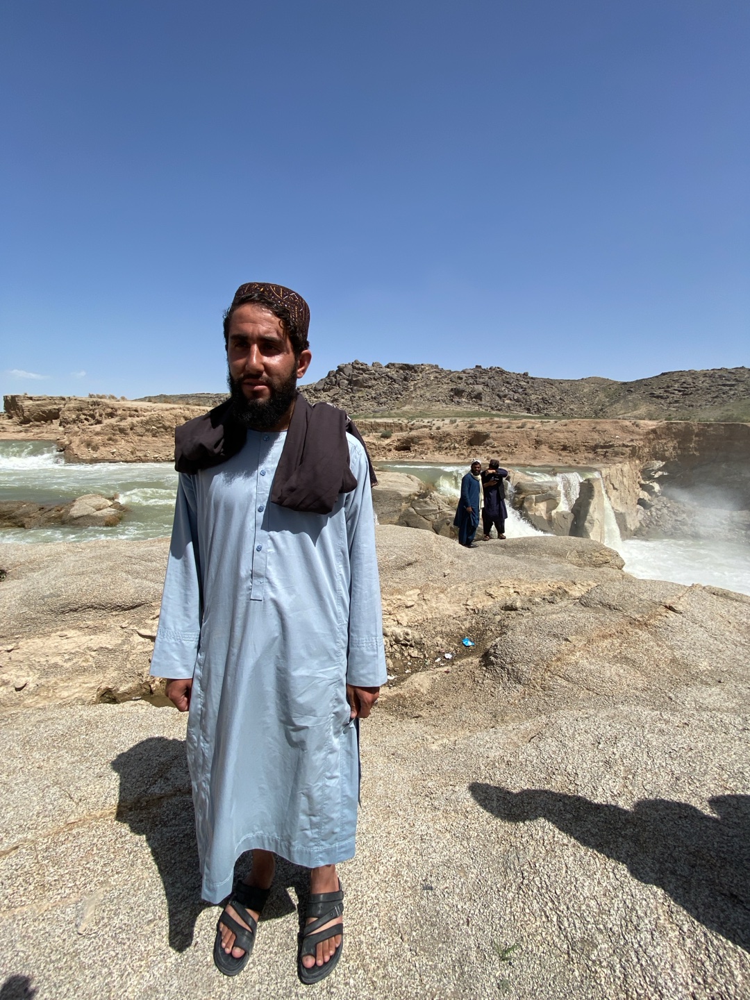 The image shows a man standing in front of a waterfall and rocky landscape in Abdol Ahadkhan Kariz, Afghanistan. He is wearing a light blue traditional Afghan dress, sandals, and a head covering, with…read more
