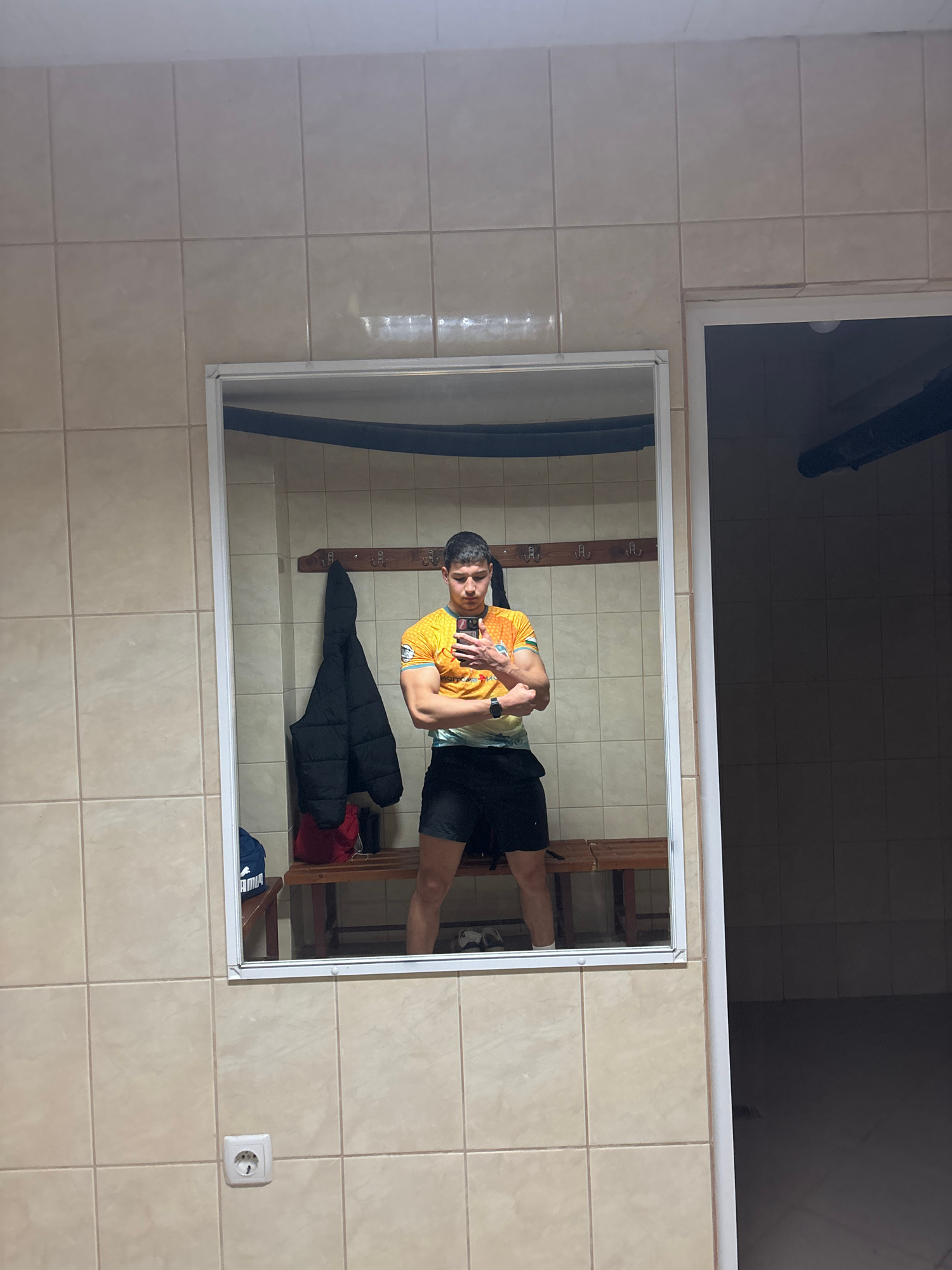 A man is reflected in a mirror in a room with tiled walls. He is holding a smartphone and taking a selfie. The man is wearing a yellow and orange patterned t-shirt and black shorts. Behind him, a blac…read more