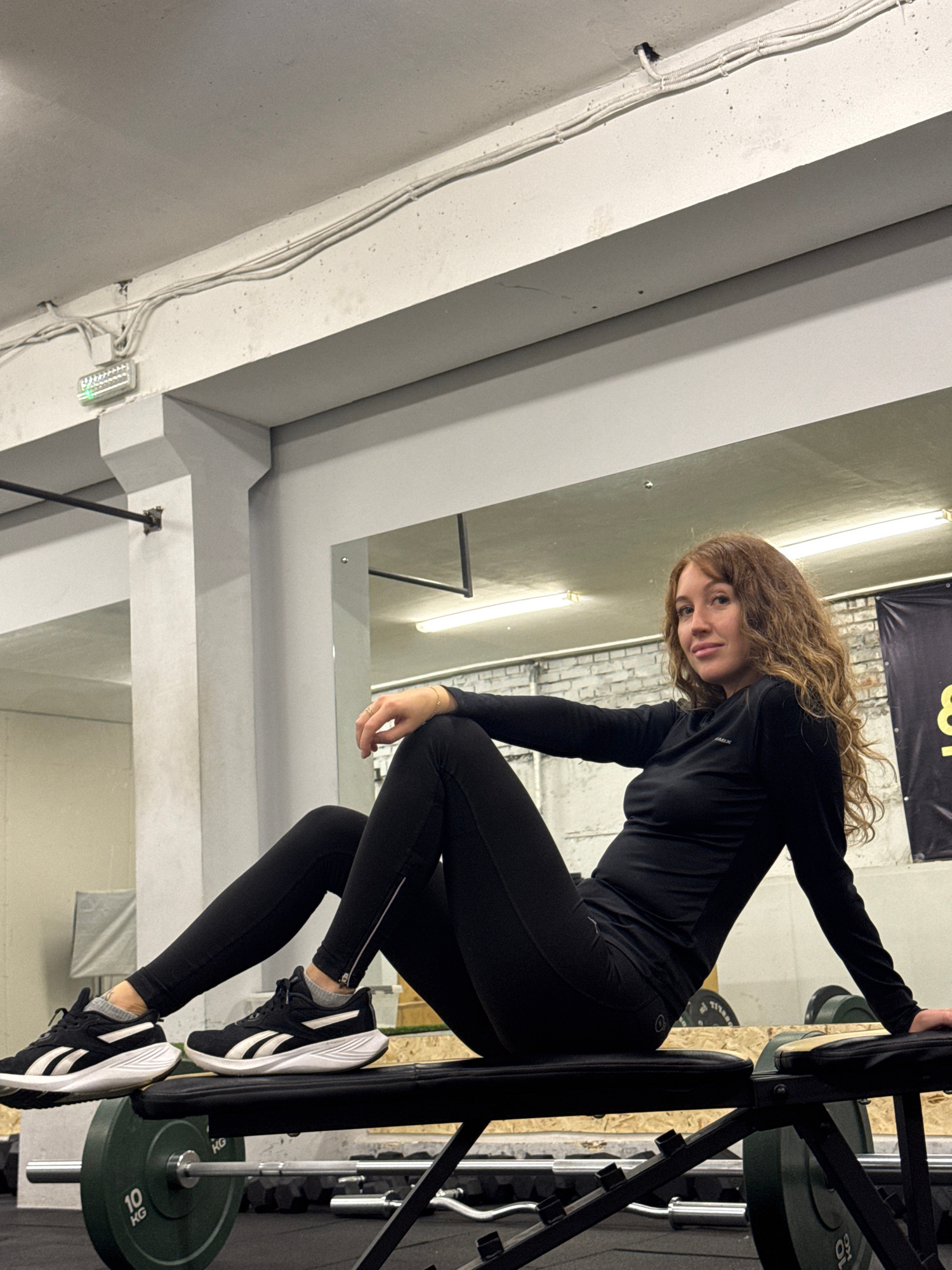 A young woman with curly brown hair is posing in a gym setting. She is wearing a long-sleeved black top, black leggings, and black and white sneakers. She is holding onto a squat rack loaded with weig…read more