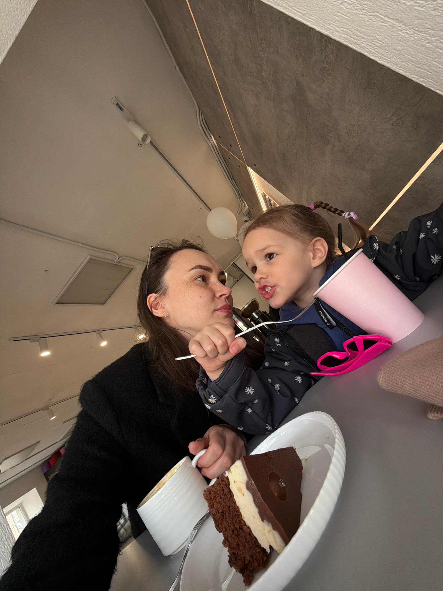 A woman and a young child are at a table. The child, wearing a dark jacket with white flowers, is holding a pink cup and pink sunglasses. A slice of chocolate and white cake is on a white plate. The w…read more