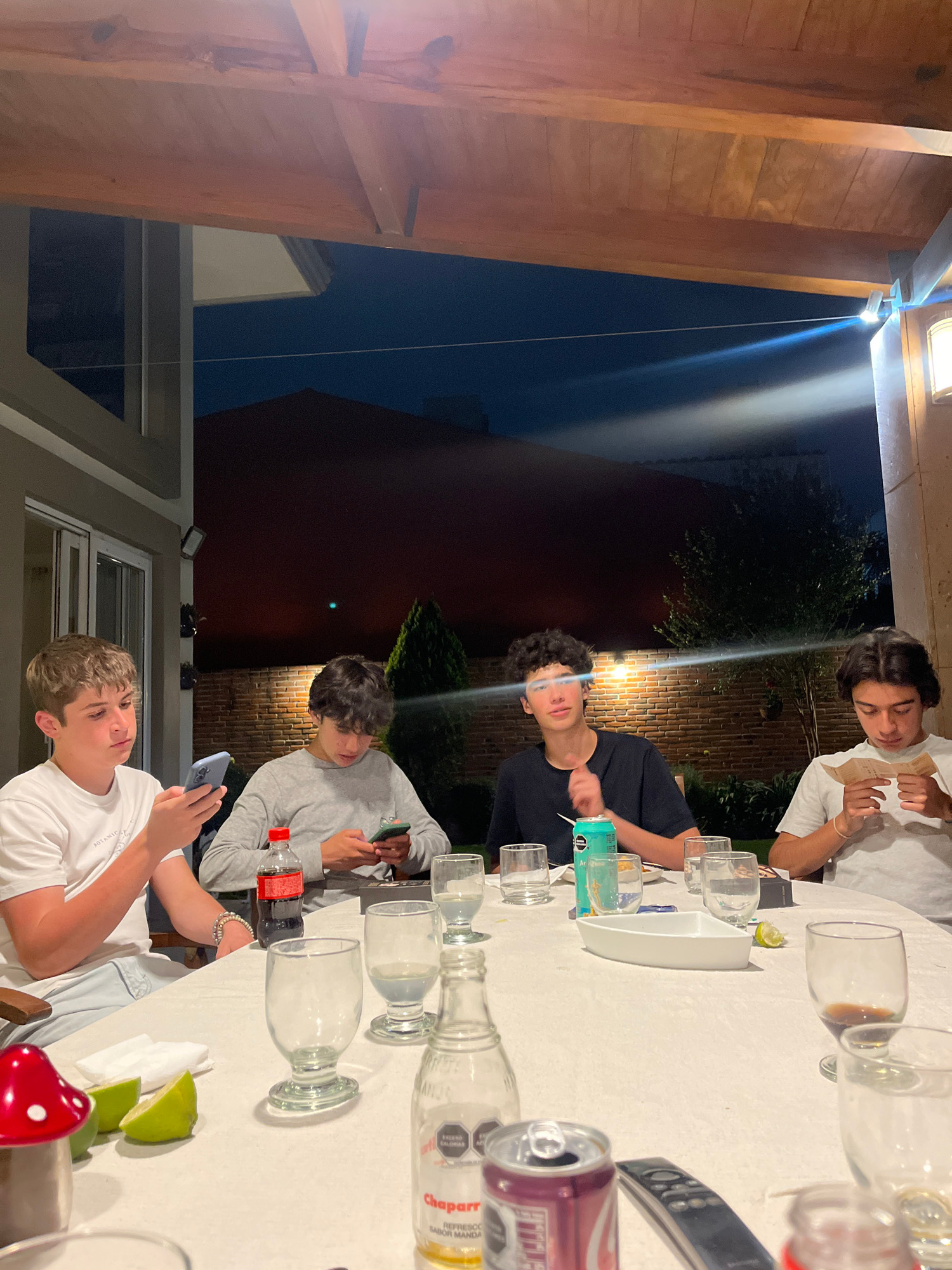 The image captures a casual nighttime gathering of young men around a white table on an outdoor patio, likely in Cholula, Mexico. Approximately five individuals, appearing to be in their teens or earl…read more