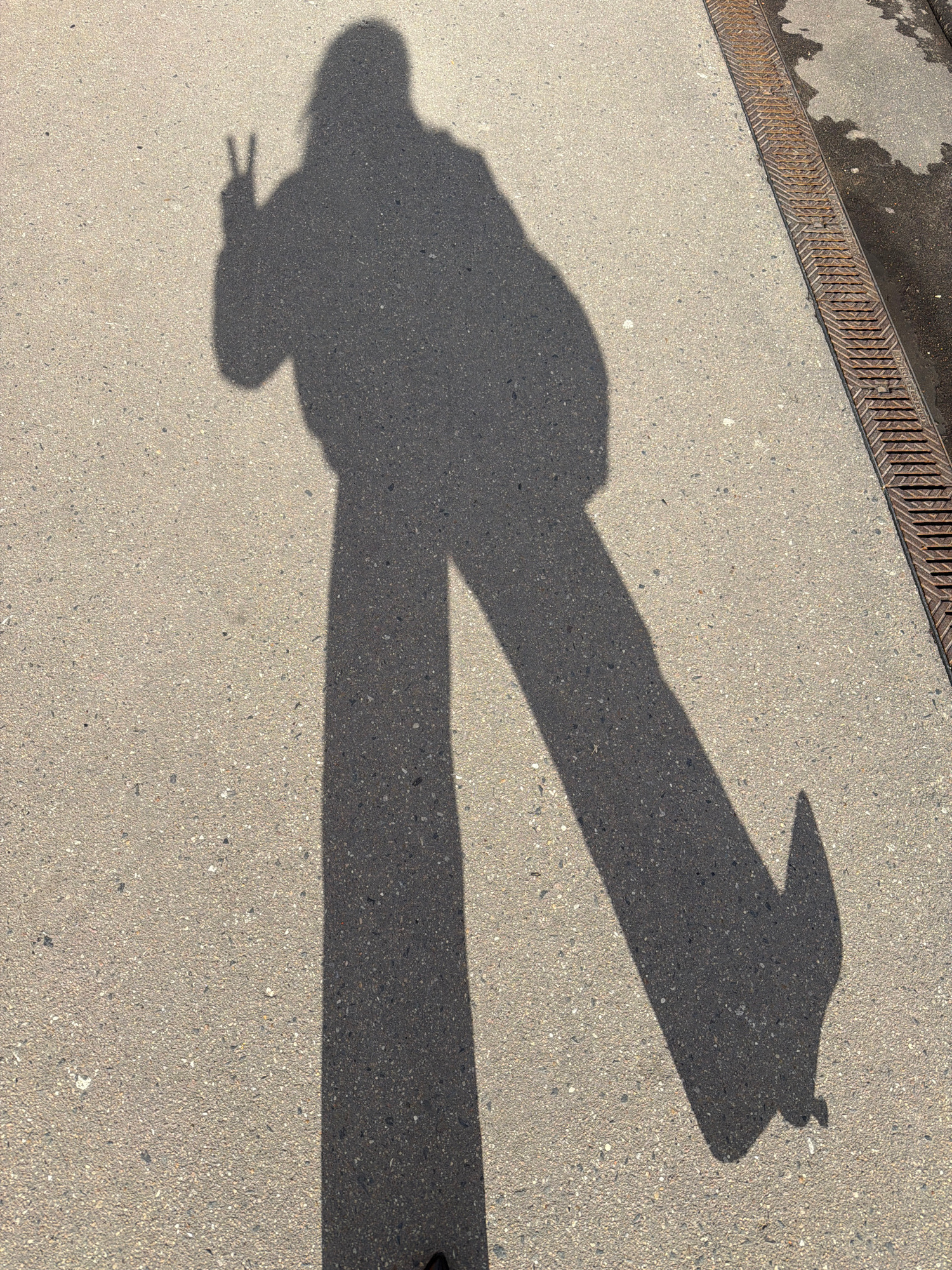 An overhead shot captures a long, distinct shadow of a person on a light gray asphalt surface, with a metallic drainage grate running along the top edge of the frame. The strong sunlight indicates a b…read more