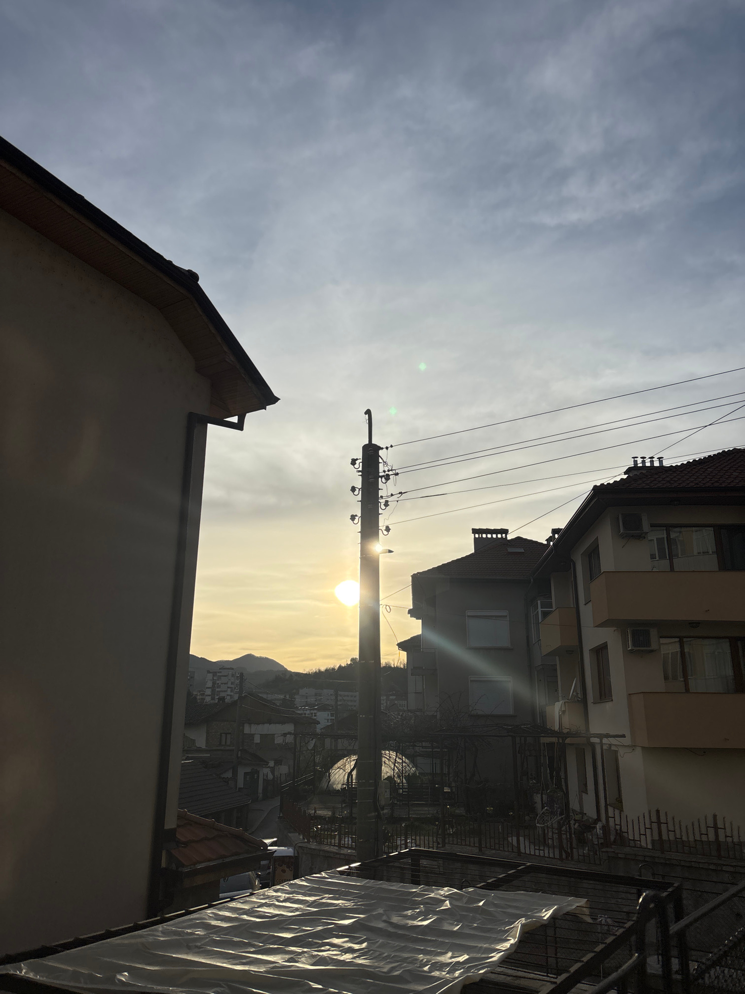 The image, taken in Zlatograd, Bulgaria, shows a view of buildings and a utility pole silhouetted against a bright sky with the sun partially obscured by clouds. In the foreground, the corner of a lig…read more