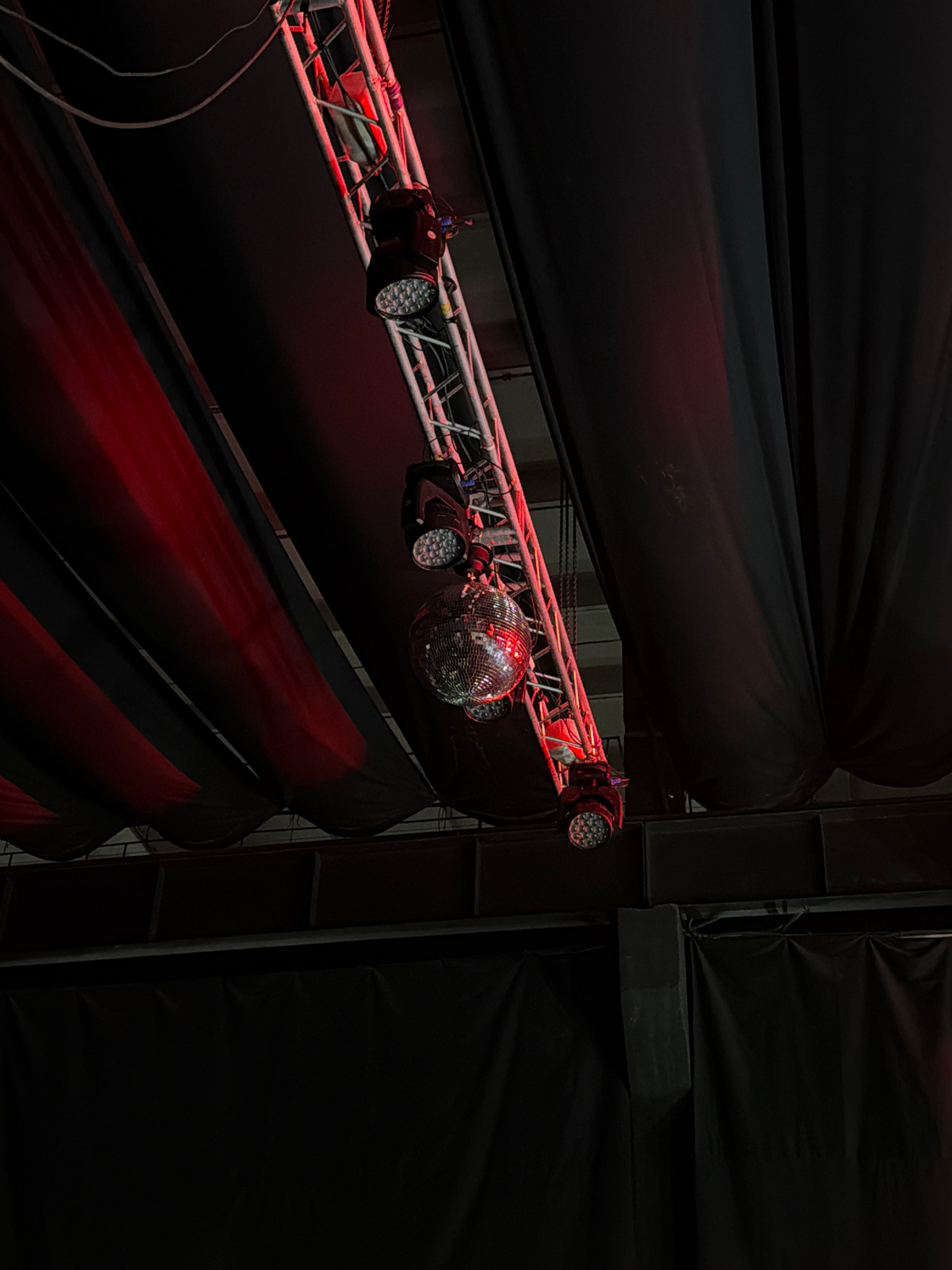 The image depicts a dimly lit indoor space in Perm, Russia. A metal truss is visible, rigged with several stage lights and a mirrored disco ball. Red light illuminates portions of the truss and reflec…read more