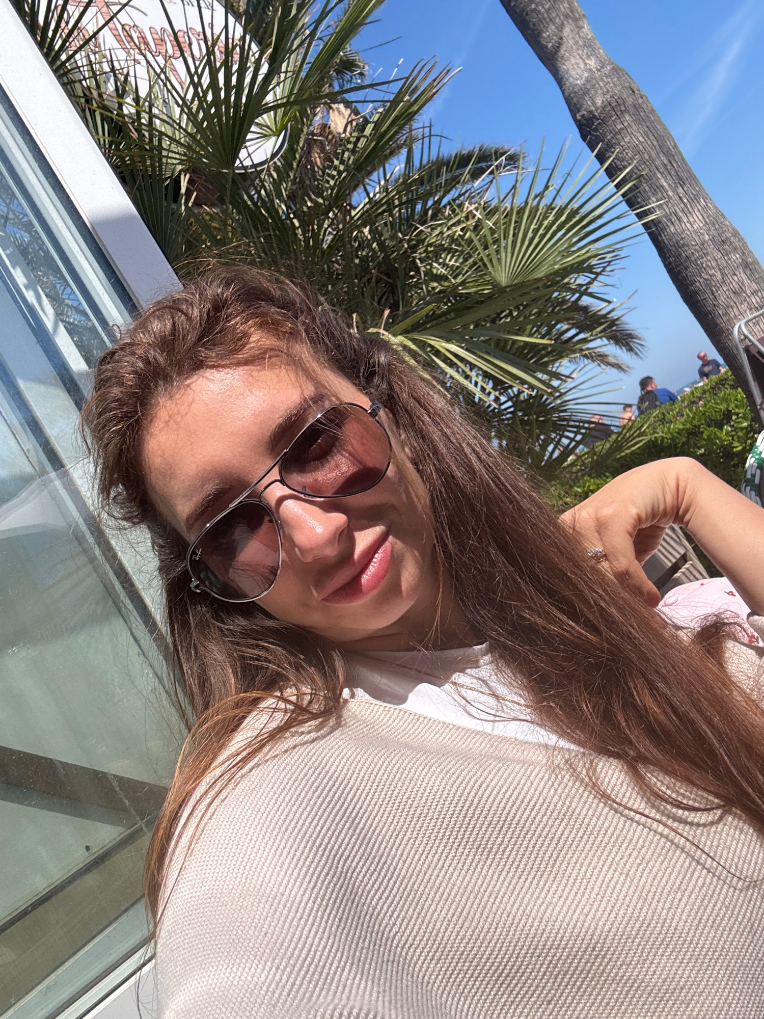 A selfie taken outdoors in Valencia, Spain, presents a woman wearing sunglasses. The backdrop reveals palm trees and blue sky.