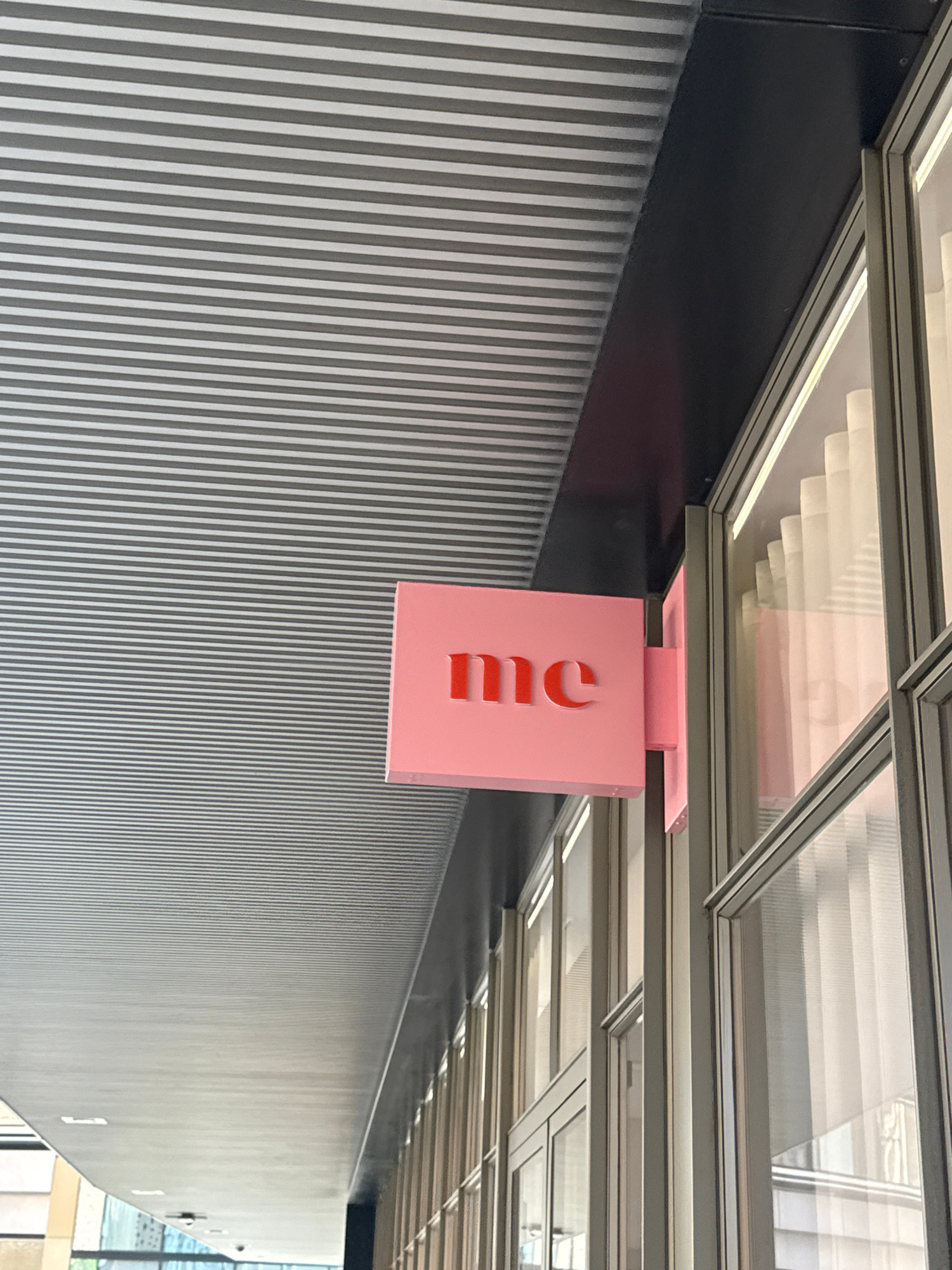 The image depicts a pink cuboid sign with the word "me" cut out in a stylized font, hanging from the ceiling within what appears to be an interior space. The background consists of a wall with vertica…read more