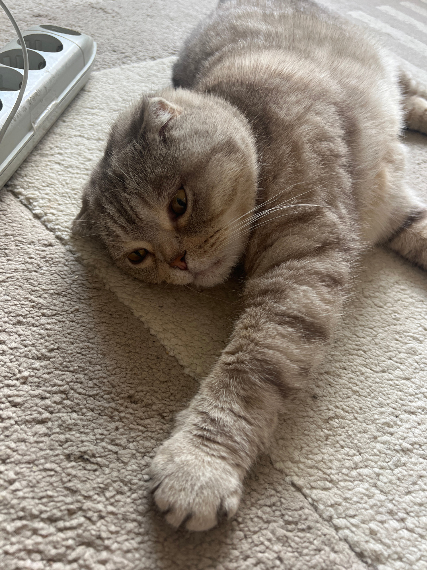 An overhead shot captures a relaxed Scottish Fold cat lying on a light-colored, textured carpet in Chaikovsky, Russia. The cat, with soft grey-beige fur and subtle tabby stripes, is stretched out on i…read more