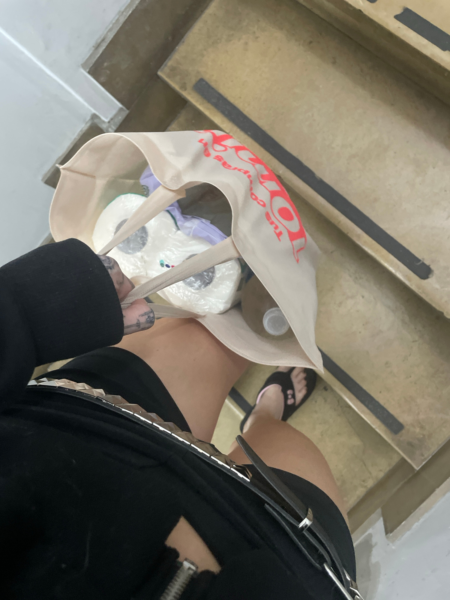 A person with a tattooed hand carries a "The Container Store" bag containing toilet paper and a plastic bottle while standing on beige stairs with black traction strips. They are wearing black flip-fl…read more